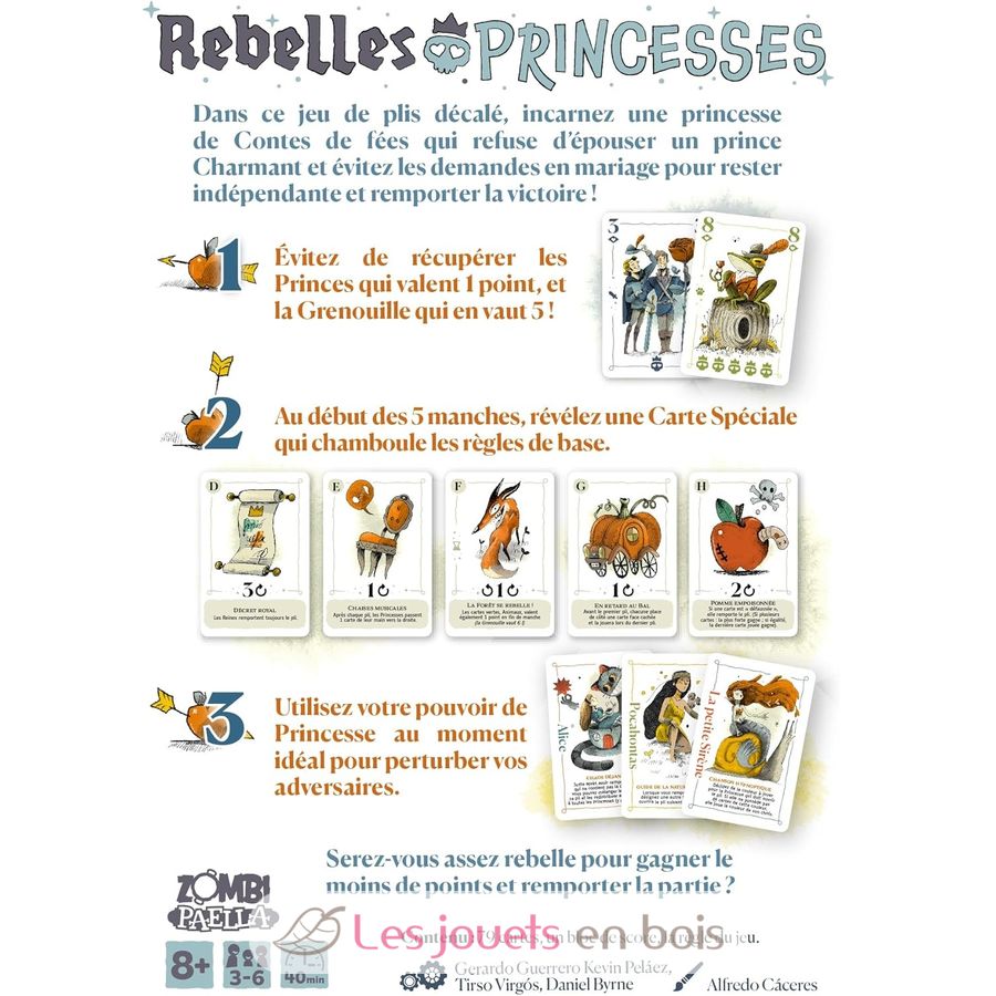 Dans ce jeu de plis décalé, incarnez une princesse de Contes de fées qui refuse d’épouser un prince Charmant ! Évitez les demandes en mariage qui vous feront marquer des points et utilisez votre pouvoir de Princesse pour vous sortir des situations difficiles. La princesse qui a le moins de points à la fin des 5 manches remporte la victoire !