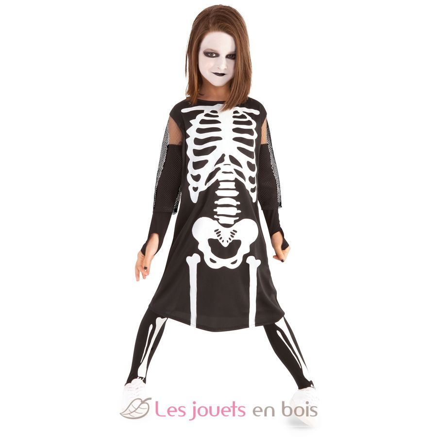 Ce déguisement pour enfant comprend une robe noire sans manche imprimée d’un squelette blanc, une paire de manchettes noire avec tulle imprimées et une paire de bas imprimés.