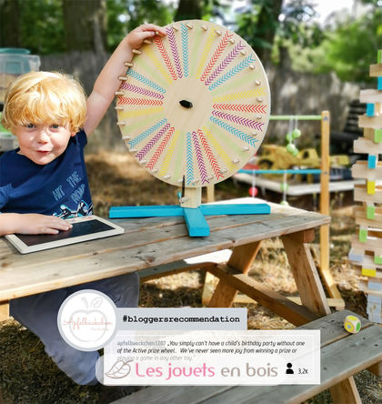 La roue de la fortune est livrée avec un disque tournant réversible et facile à transformer. Le disque est équipé d'un côté avec 30 champs de couleurs et de l'autre côté avec un tableau noir. Cela signifie que vous pouvez créer votre propre répartition. Sur le petit tableau, les équipes et les points peuvent être notés afin de couronner le vainqueur à la fin !