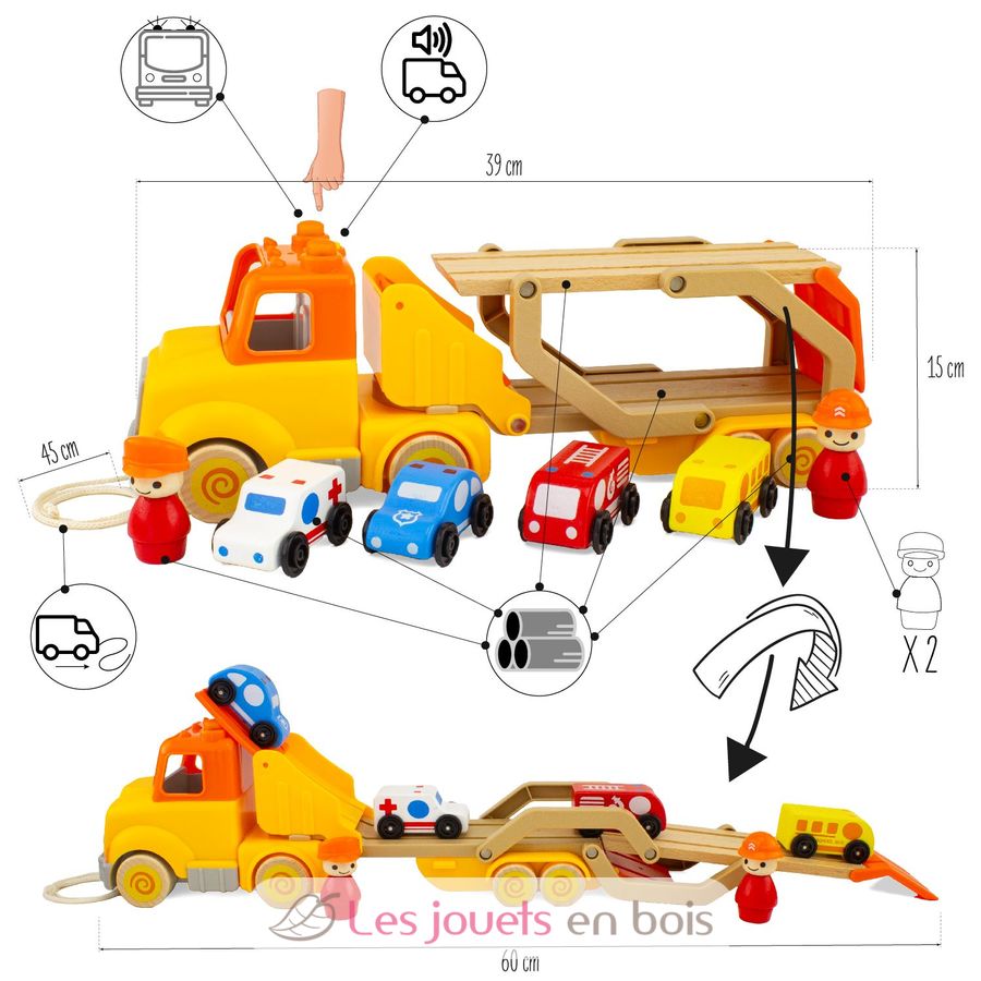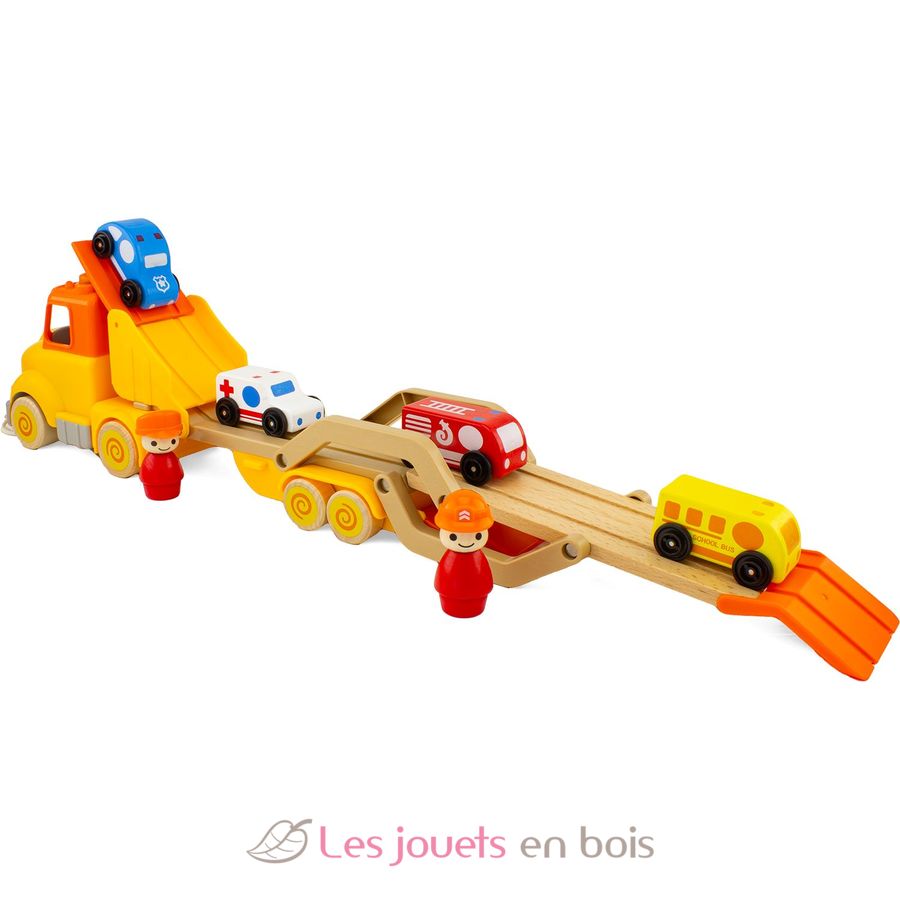 Ce camion est livré avec 2 personnages amovibles et 4 voitures en bois, offrant une multitude de scénarios de jeu à l'enfant.