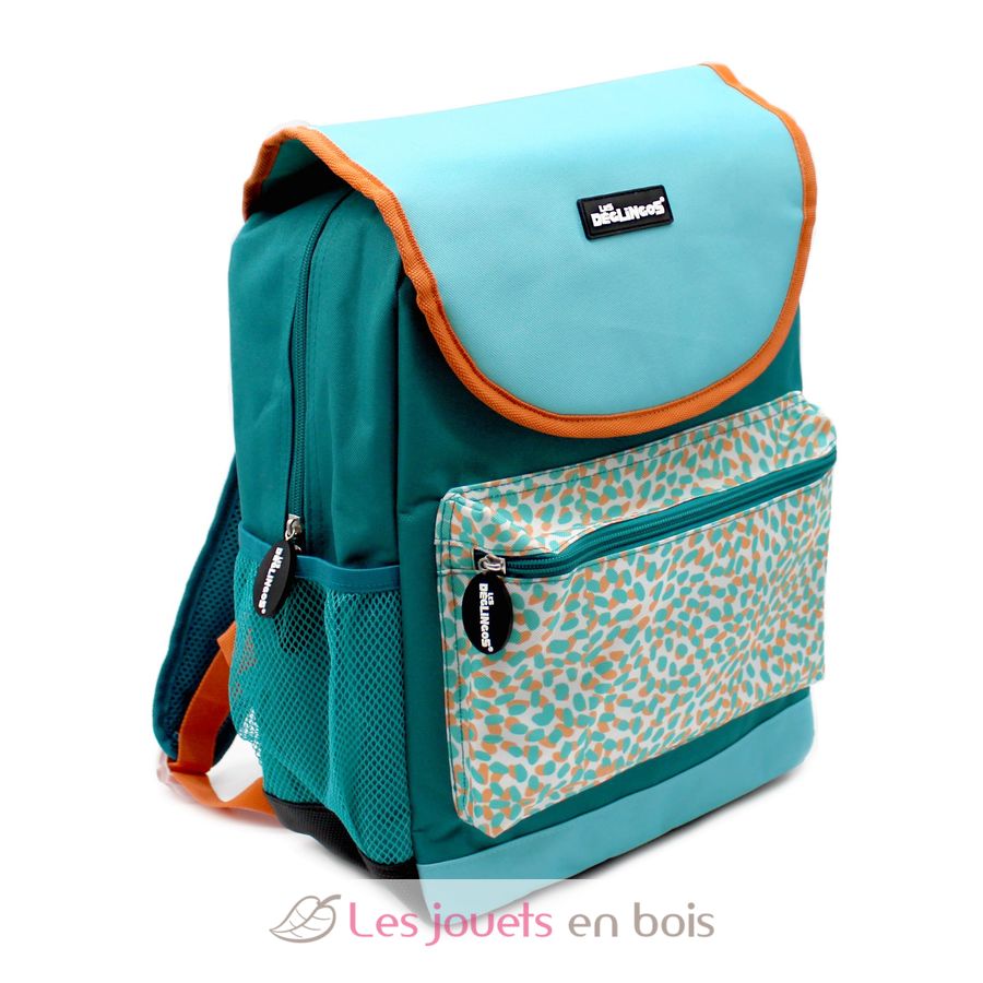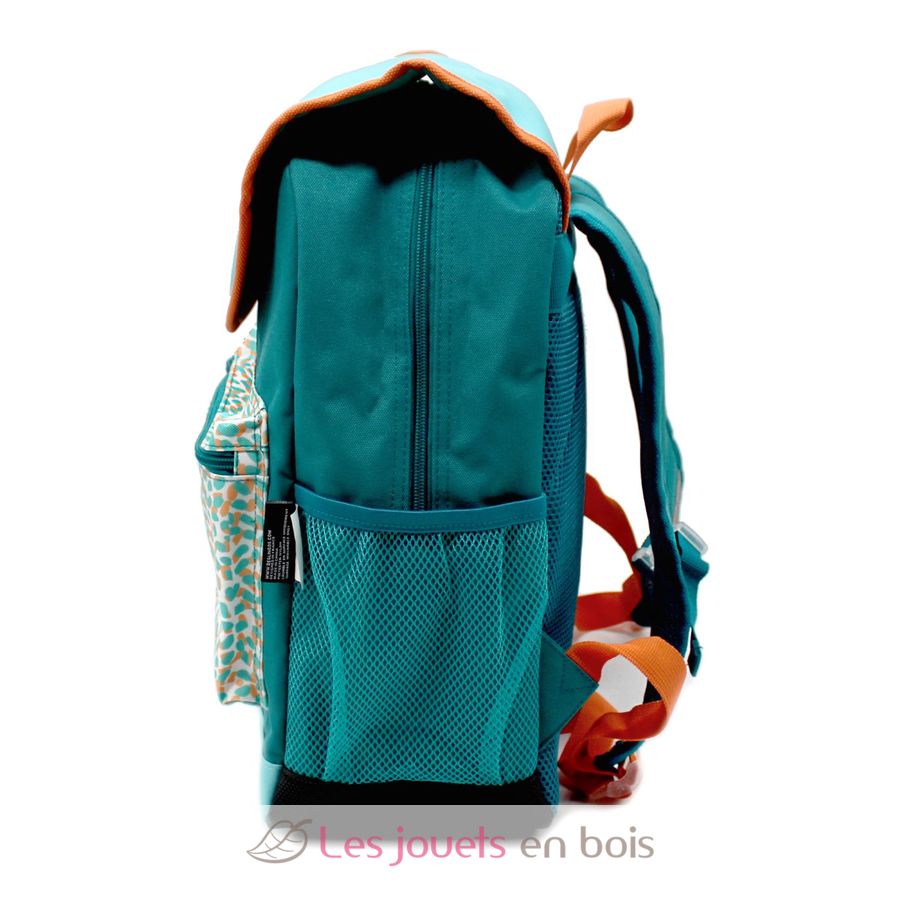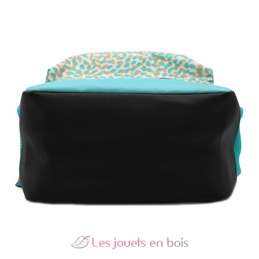 Le sac à dos à l'effigie de Berlingos le koala est bleu-vert aux motifs colorés. Dimensions : 29 x 39 x 16 cm. Matières : polyester et rembourrage en polyester recyclé.