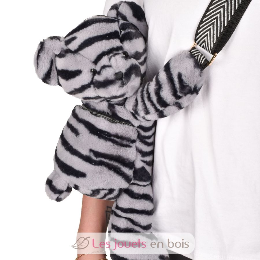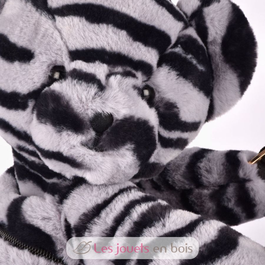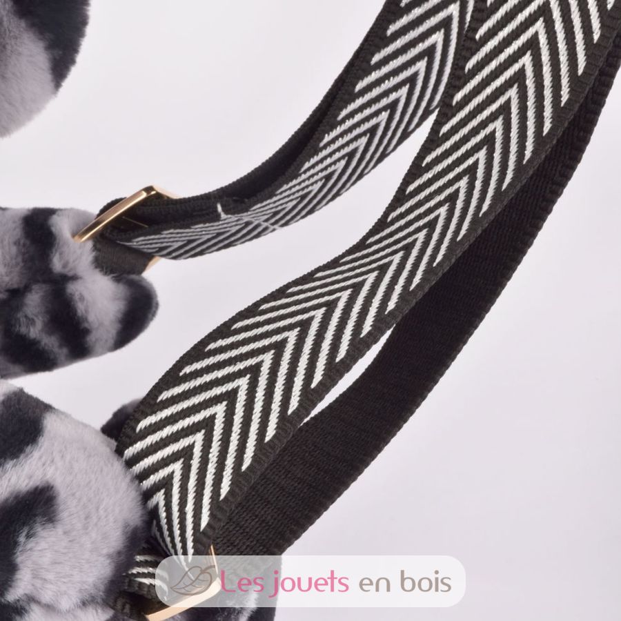 Adoptez le sac doudou, un accessoire plein de charme et de douceur. Véritable peluche à porter, cet ours zébré noir et gris est aussi moelleux qu’élégant avec sa bandoulière à chevrons.
