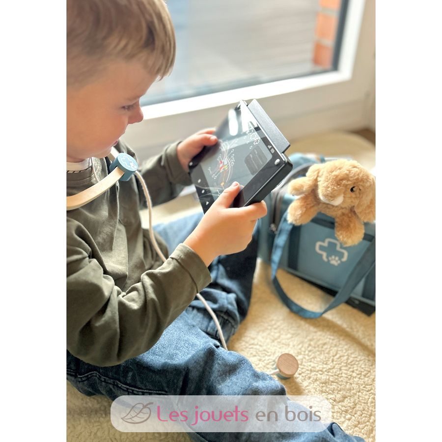Les nombreux accessoires offrent tout ce dont les petits vétérinaires ont besoin : un stéthoscope, un thermomètre, un otoscope, une seringue, des bandages, un collerette vétérinaire et même une tablette pour visualiser les radiographies, y compris quatre radiographies (chien, chat, lapin, cheval). Les plaques radiographiques sont également imprimées au dos avec un formulaire de contrôle. Une pince à tiques, une pince, des médicaments et un carnet de vaccination complètent l'ensemble, ainsi qu'une carte de rendez-vous et un questionnaire médical, tandis que le poster au format A5 représentant différentes races de chiens peut être accroché dans le cabinet vétérinaire. Particulièrement pratique : le sac sert non seulement de boîte de transport pour le lapin, mais aussi de mallette de docteur utile qui permet de ranger et de transporter facilement le matériel.
