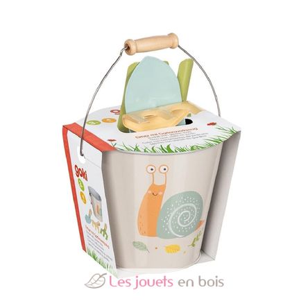 Seau avec outils de jardin Escargot, un set d'outils de jardin pour enfant de la marque Goki.
