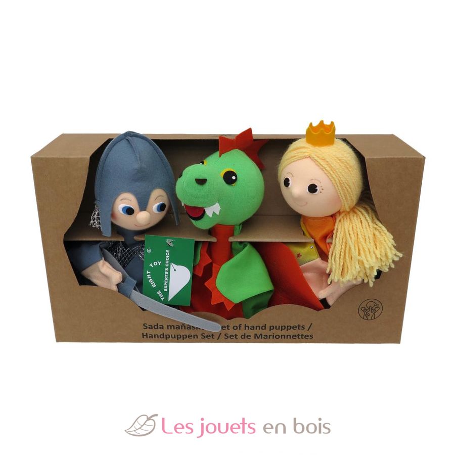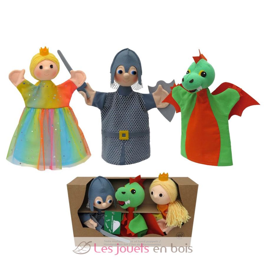 Coffret de 3 marionnettes à main sur le thème du Dragon : Un Dragon, un Chevalier et une Princesse.