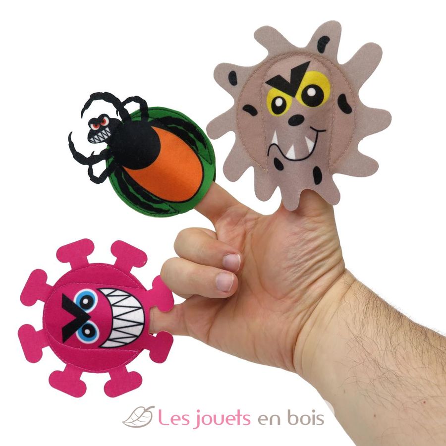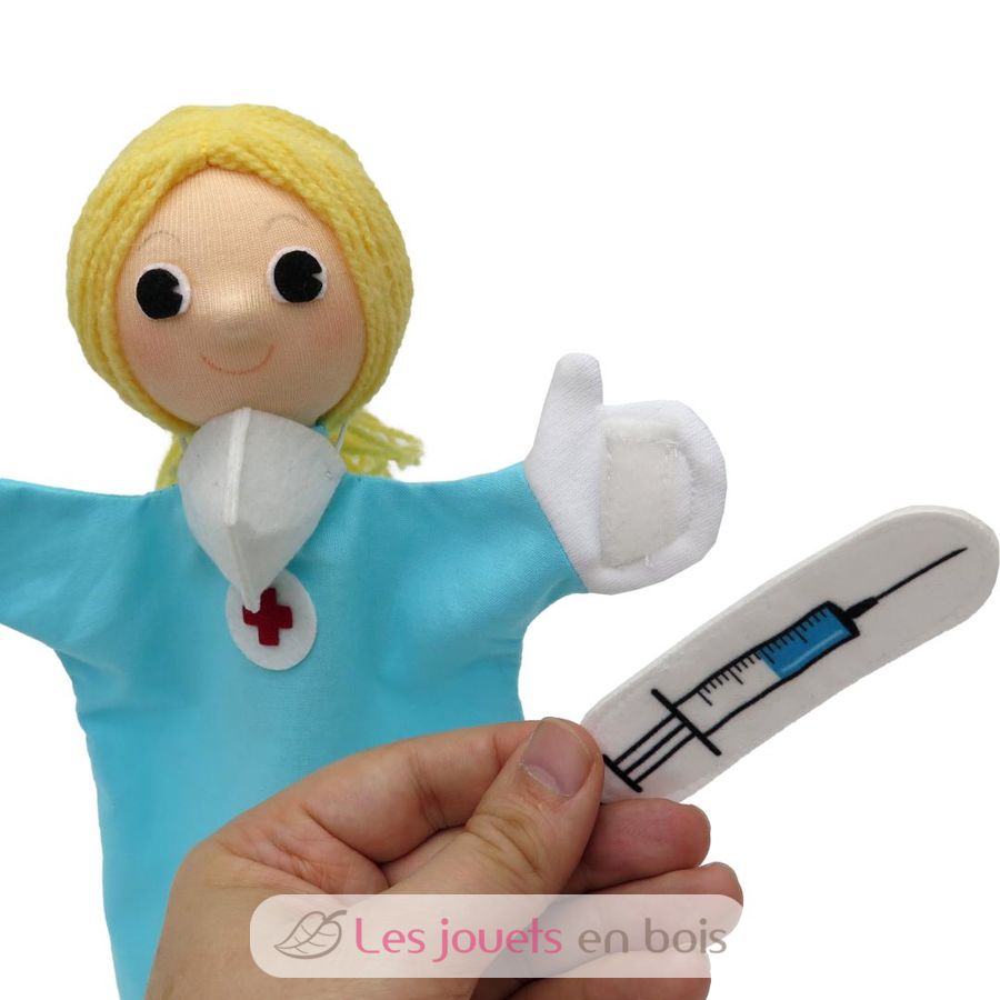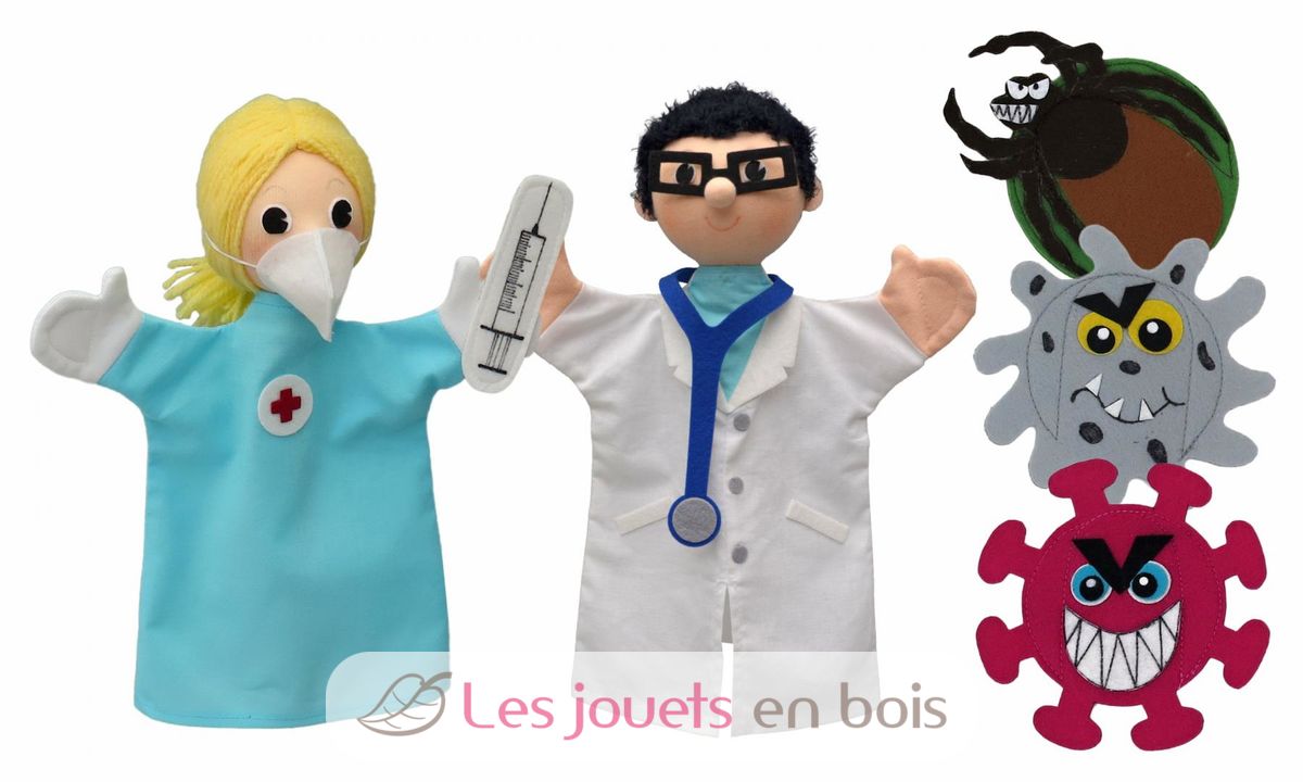 Le médecin et l'infirmière sont des marionnettes à main. Le coronavirus, l’hépatite et la tique sont des marionnettes à doigts. L'infirmière dispose d'un masque facial amovible et d'une seringue fixée par velcro.