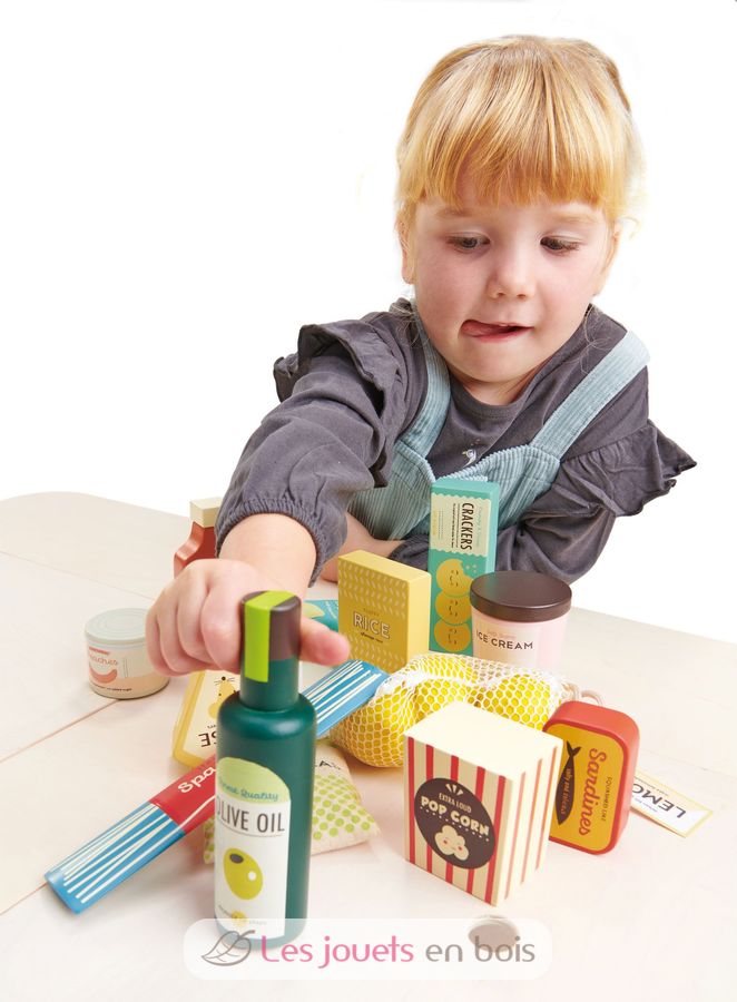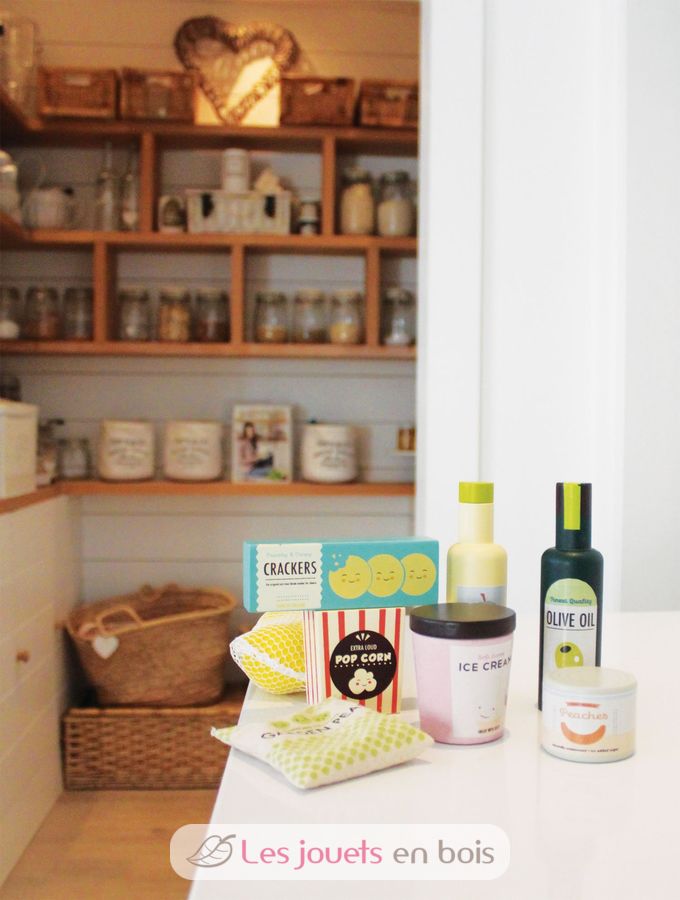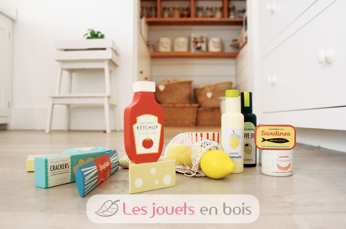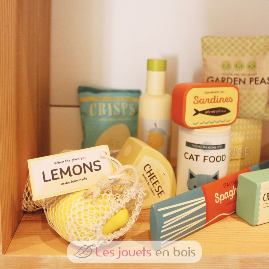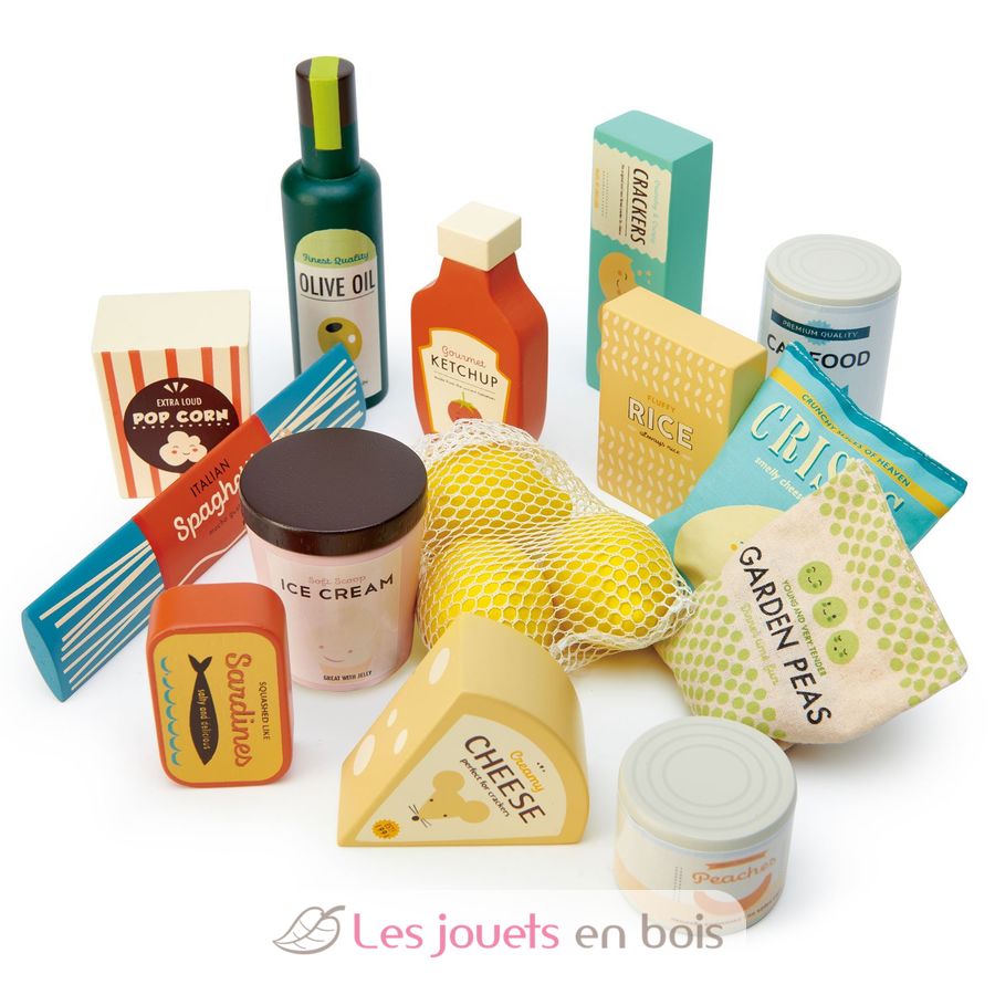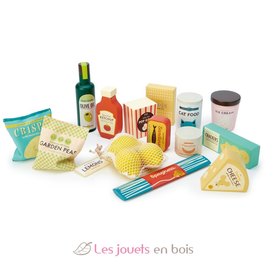 Cet ensemble de produits d'épicerie de la marque Tender Leaf Toys comprend 17 accessoires en bois et tissu: un pot de crème glacée, un pot de pop-corn, de la nourriture pour chat, une boîte de pêches au sirop, du ketchup, de l'huile d'olive, un filet avec trois citrons, un sachet de chips avec du papier froissé à l'intérieur, un sac de petits pois surgelés contenant des boules rondes dures, une boîte de sardines, une boîte de riz, un paquet de spaghettis, une boîte de craquelins et un morceau de fromage.