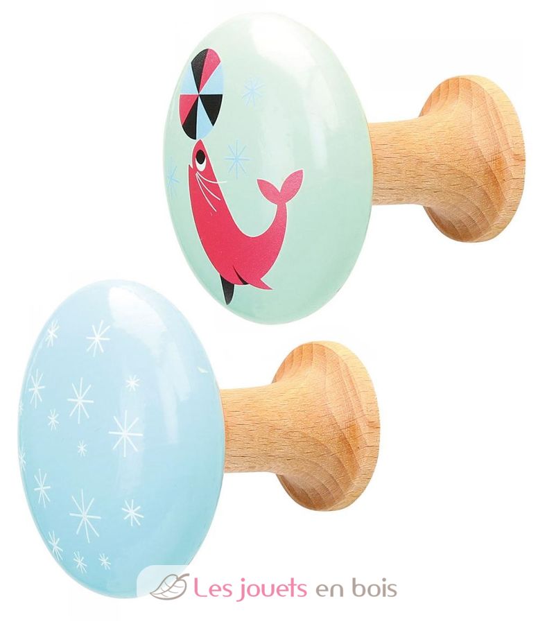 Un joli set de deux patères en bois massif laqué, modèle Otarie. Illustré par Ingela P. Arrhenius et fabriqué en France par la marque Vilac.