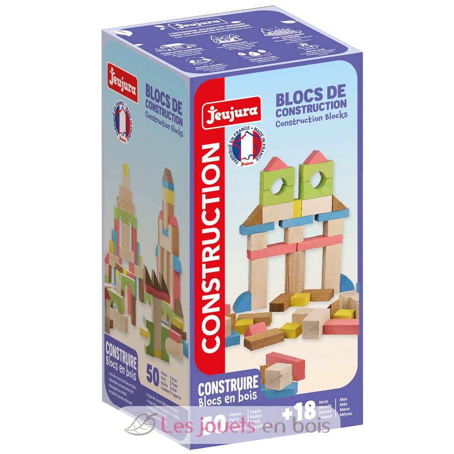 50 blocs de construction en bois de la marque Jeujura. A partir de 18 mois.