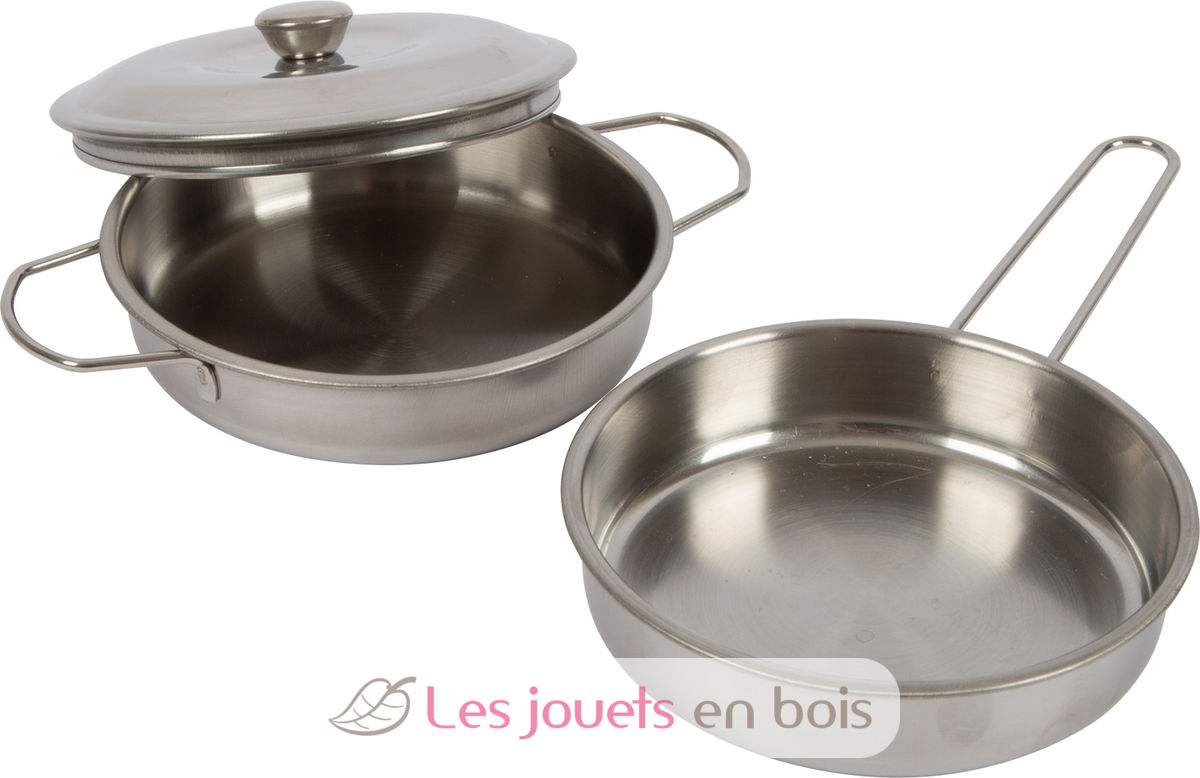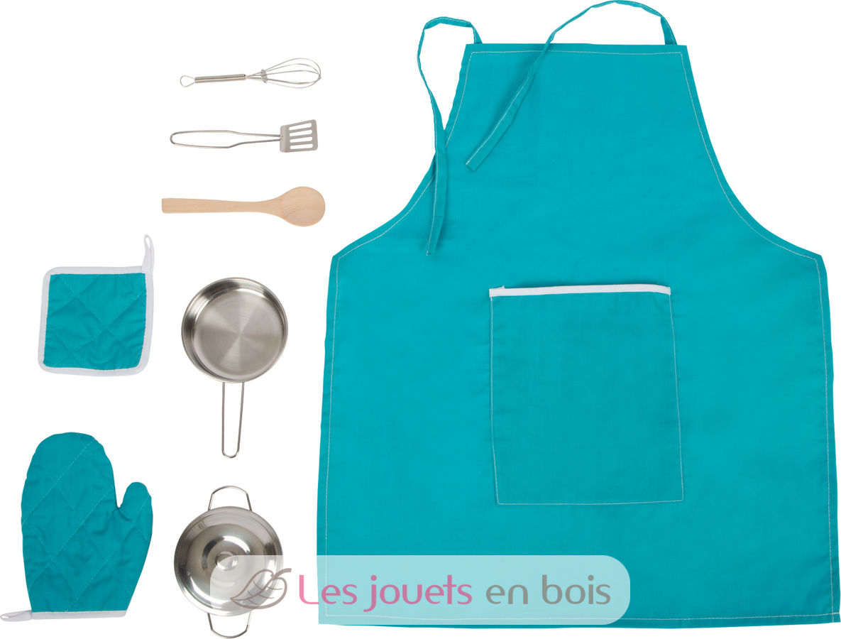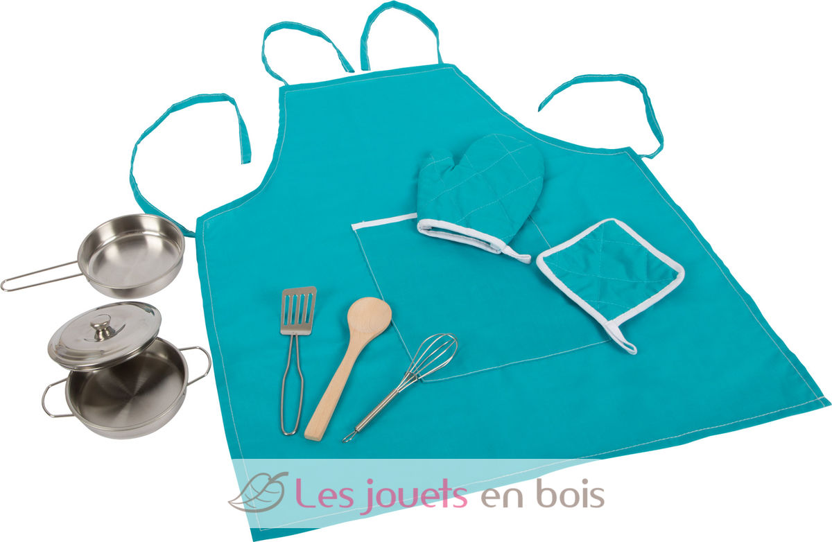 Avec une casserole avec couvercle, une poêle, un fouet, une spatule et une cuillère en bois, ainsi qu'un tablier pour enfant, une manique et un gant rembourré, les petits cuisiniers ont tous les accessoires nécessaires pour cuisiner comme les grands !