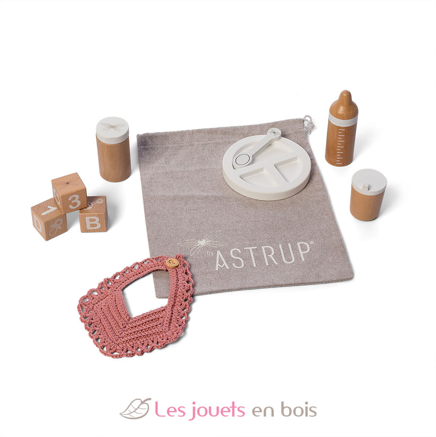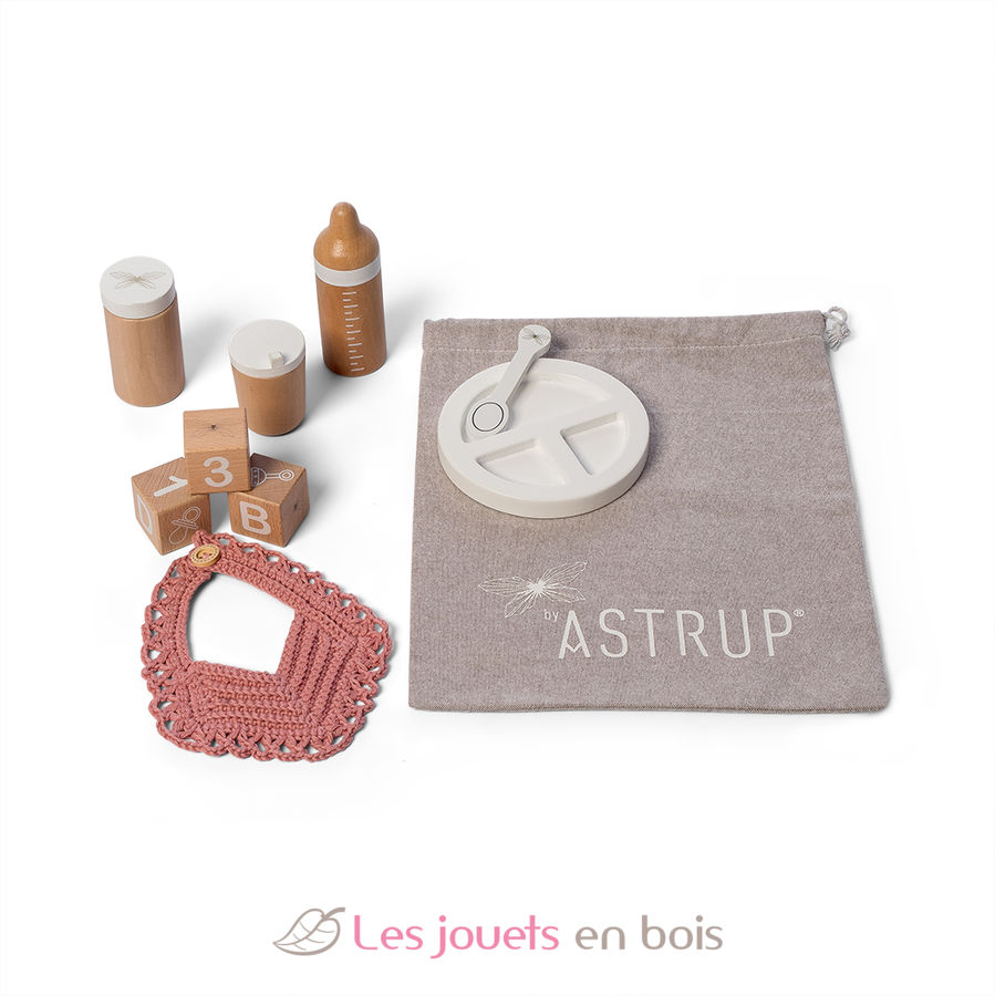 Ce set de repas 9 pièces, de la marque By Astrup, est idéal pour le repas de vos poupées et peluches préférées. Très complet, il se compose d’une assiette compartimentée, d’une cuillère, d’un biberon (9 cm de hauteur), d’un verre à couvercle, d’un petit pot, de trois cubes de jeux et d’un ravissant bavoir en crochet. 8 accessoires en bois et 1 bavoir en crochet pour le repas des poupées ! L’ensemble est livré avec un petit pochon en tissu pour un rangement facile et pratique. Ce set est idéal pour accessoiriser la chaise haute 2en1 By Astrup (réf 84145).