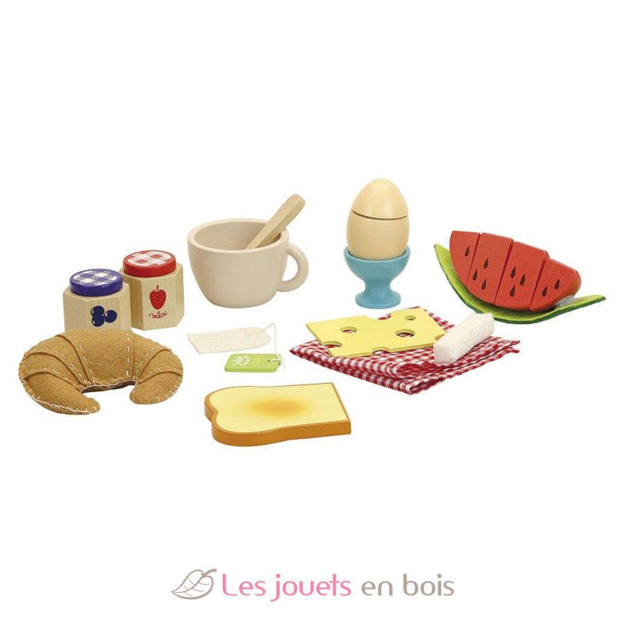 Un set petit déjeuner original avec un œuf à découper dans lequel on trempe sa mouillette, 1 tartine, du fromage, un croissant, des pots de confitures à ouvrir, 1 tasse de thé et son sachet, ainsi qu'une pastèque à découper... Ce set vient compléter la gamme " Jour de Marché" de la marque Vilac. Hummmm ! Un vrai bon petit déjeuner à préparer pour la dînette des enfants. Éléments en bois et feutrine.