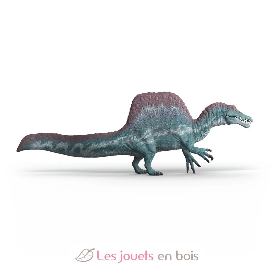 Le Spinosaure ou « lézard épineux » figure parmi les plus longs dinosaures connus, mesurant jusqu’à 18 m de long, 6 m de haut et pouvant atteindre 9 tonnes. Facilement reconnaissable à ses très grandes épines dorsales, on suppose qu’il possédait un voile remplissant la fonction de régulateur thermique. Le Spinosaure, qui vécu au Crétacé, était à la fois carnivore et piscivore. A la fois long, étroit et munies de nombreuses dents rectilignes, le crâne du Spinosaure est de forme similaire à celui des crocodiles.