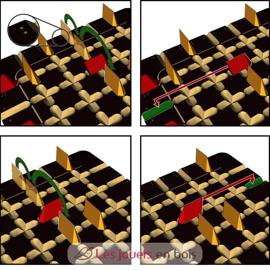 Il s'agit d'être le premier à faire un aller-retour avec 4 de ses 5 pièces sur le plateau. Les pions avancent selon la force indiquée sur leur zone de départ puis quand ils arrivent dans la zone opposée ils font demitour et avancent alors selon la force indiquée dans cette zone de retournement. Dès qu'un pion passe au-dessus d'un pion adverse ce dernier retourne dans sa base. Il faut donc bien calculer ses coups et faire preuve d'anticipation pour espérer gagner.
