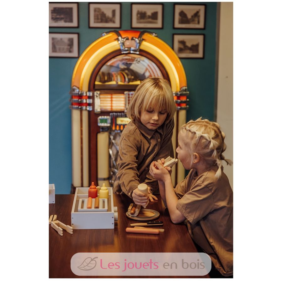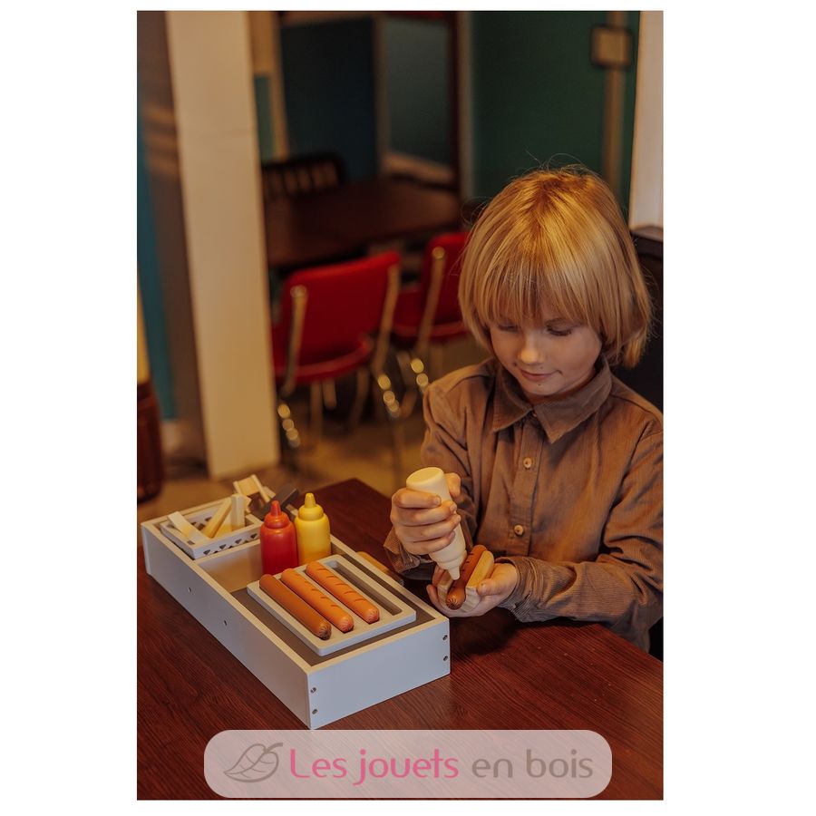 Fabriqué en bois robuste certifié FSC, ce charmant ensemble de jeu recrée l'ambiance d'un stand de restauration rapide à la maison. Il comprend tout le nécessaire pour que les enfants puissent gérer leur propre stand de hot-dogs : saucisses, frites, ketchup, moutarde et bien plus encore !