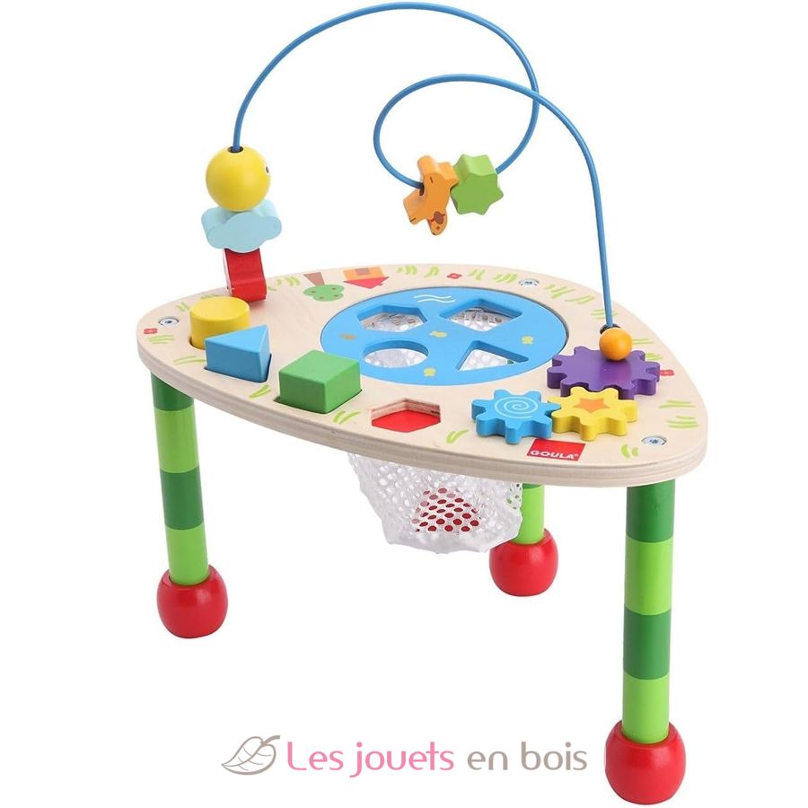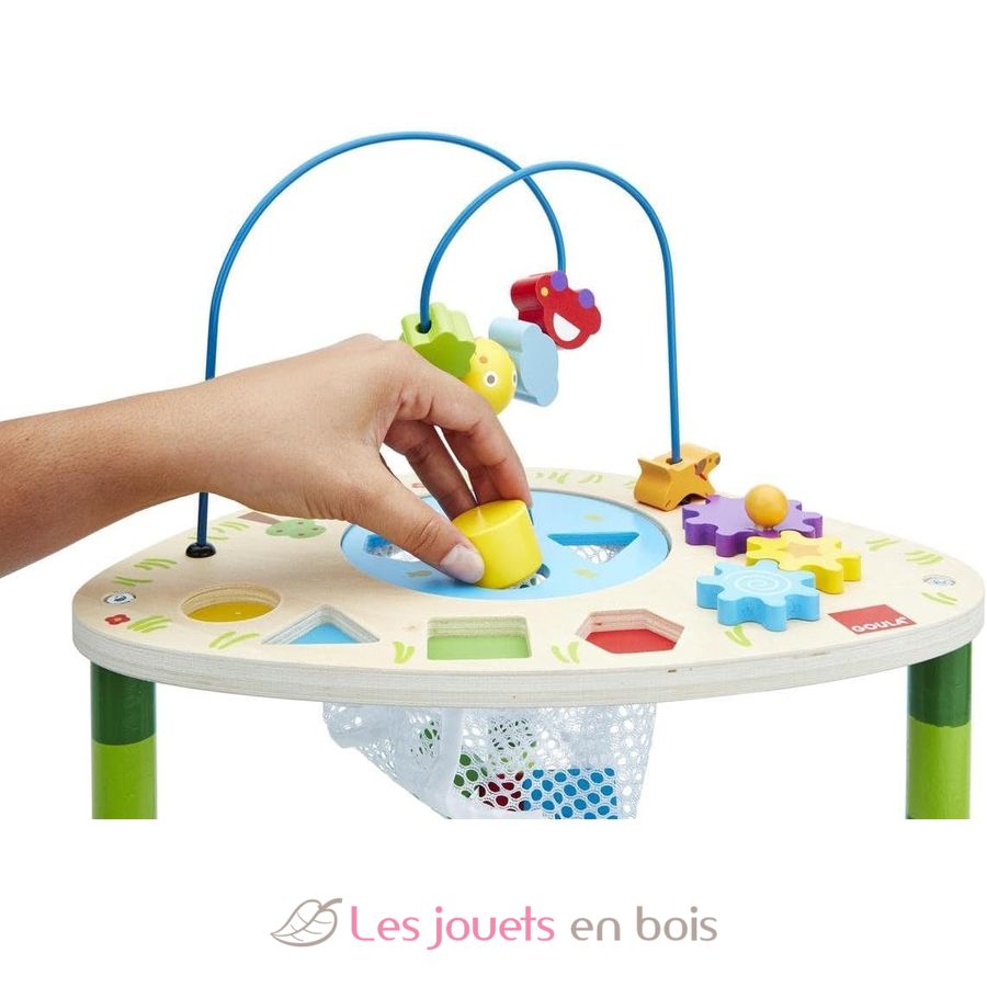 Cette table d'activité en bois se compose de pièces qui tournent, s’encastrent, tombent, glissent... Le tout avec des couleurs vives qui attirent l’attention de l’enfant.