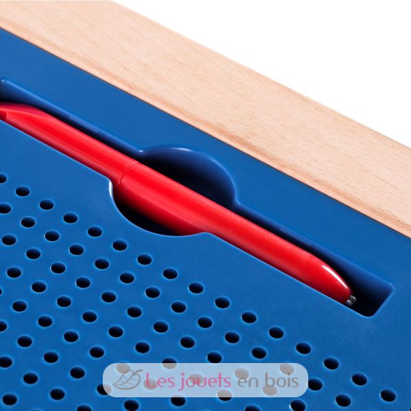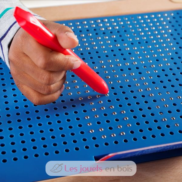 Ce jeu magnétique permet de créer des motifs et des dessins grâce à un stylo aimanté qui attire les billes métalliques incrustées dans la tablette. Une fois créé, le dessin s'efface en repoussant chacune des billes.