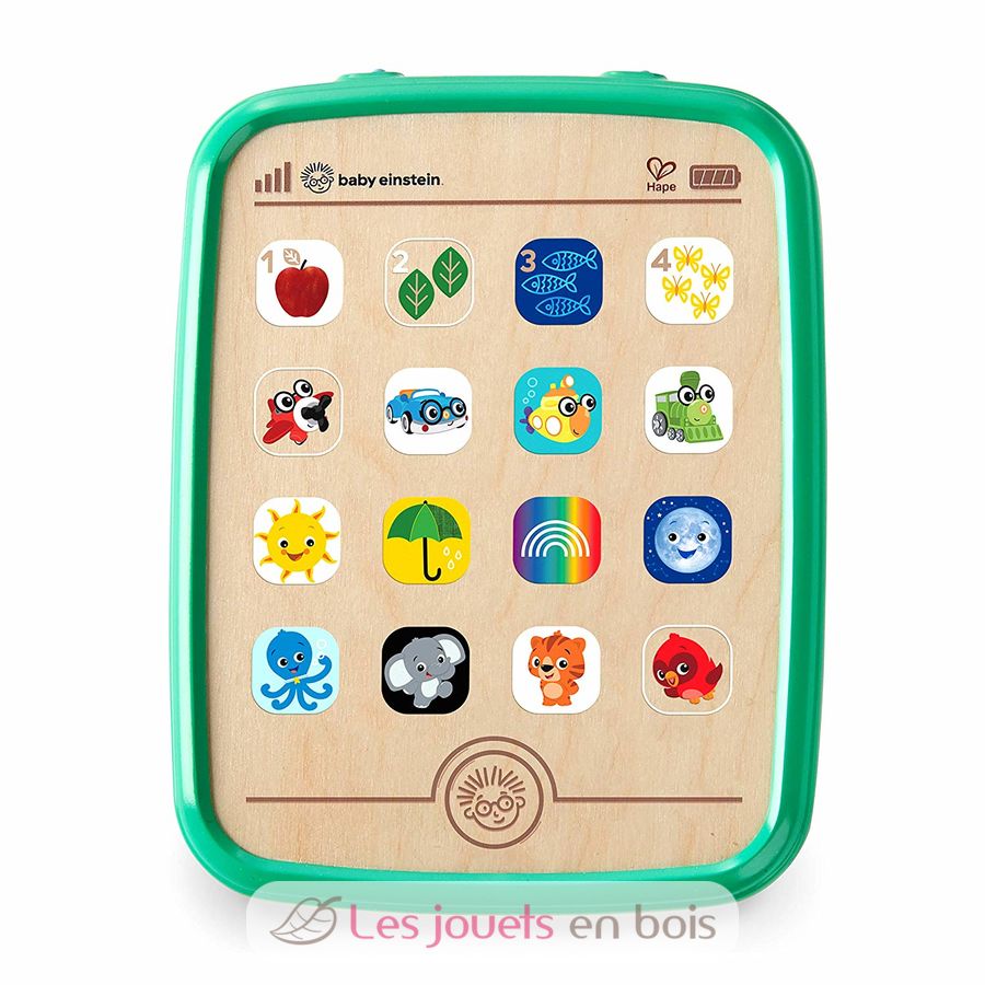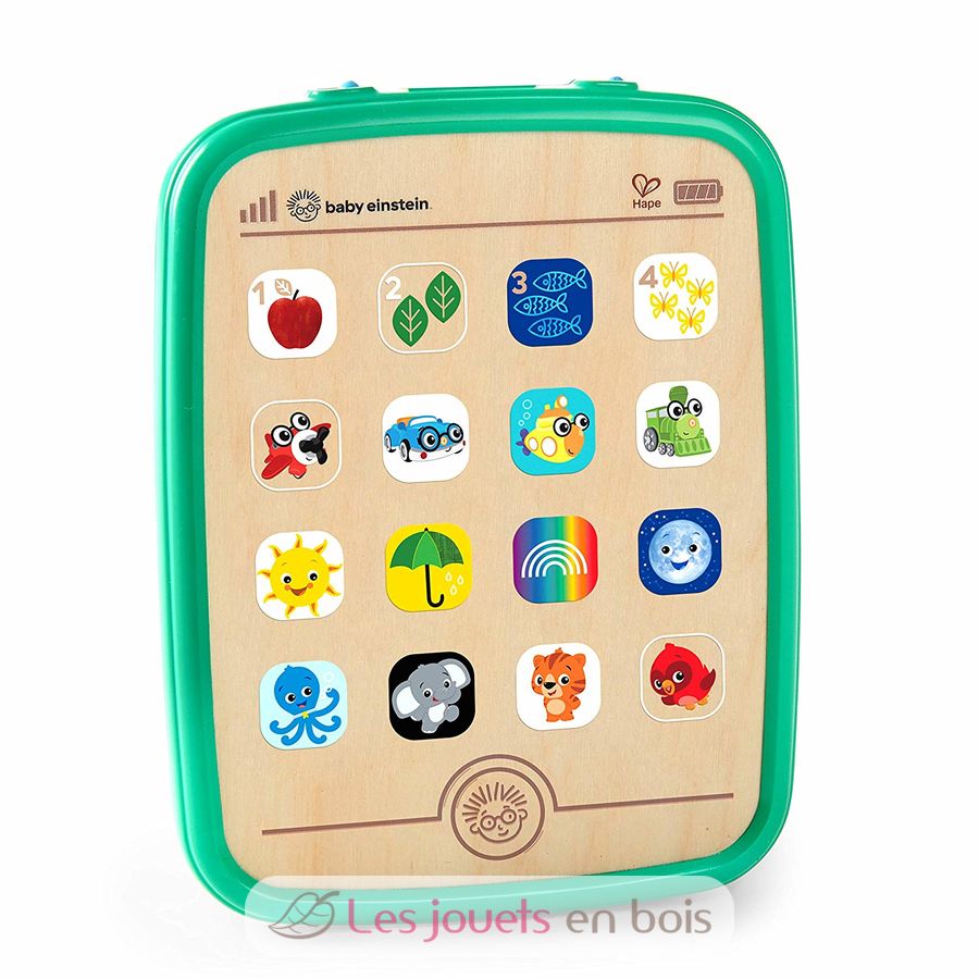 Cette première tablette en bois et plastique de la gamme Baby Einstein développe la curiosité et le langage de votre enfant. En tapotant sur chaque dessin, votre petit va découvrir le nom de l'objet, sa couleur, son bruit, une musique associée et parfois même une phrase entière avec le mot ! Avec plus de 150 sons à activer par lui-même, votre enfant va de découvertes en découvertes et n'a pas fini de s'émerveiller ! Le petit plus : tout le contenu est également disponible en anglais et espagnol.