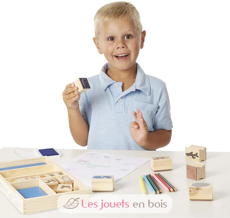 L'ensemble comprend des tampons encreurs et se range facilement dans une boîte en bois (24 pièces). Encres lavables !