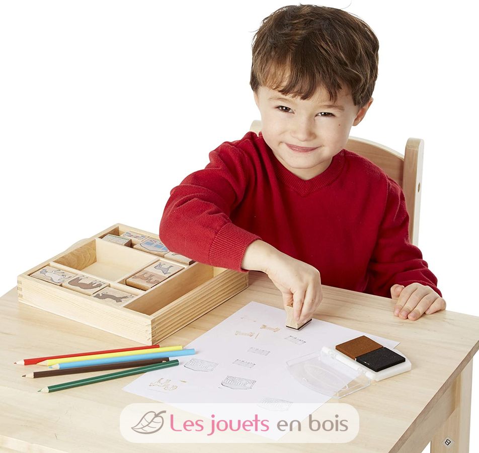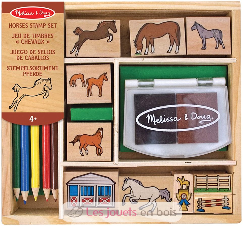 Tampons encreurs sur le thème des chevaux. Horses stamp set Choisissez parmi cet ensemble de tampons encreurs en bois détaillées pour créer des centaines de belles scènes et plus! L'ensemble comprend des tampons encreurs et se range facilement dans une boîte en bois. 15 pièces Encres lavables! ;-) Pour un enfant de plus de 3 ans. Un jouet de la fameuse marque Américaine, Melissa and Doug. Réf : 12410
