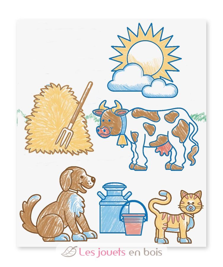 Cette grande série de tampons en bois, pour créer des histoires passionnates comprend : 20 tampons encreurs, deux couleurs d'encres lavables (brun et vert), cinq crayons de couleurs coordonnés avec le thème de la ferme pour ajouter des détails et des couleurs dans vos scènes de basse-cour.