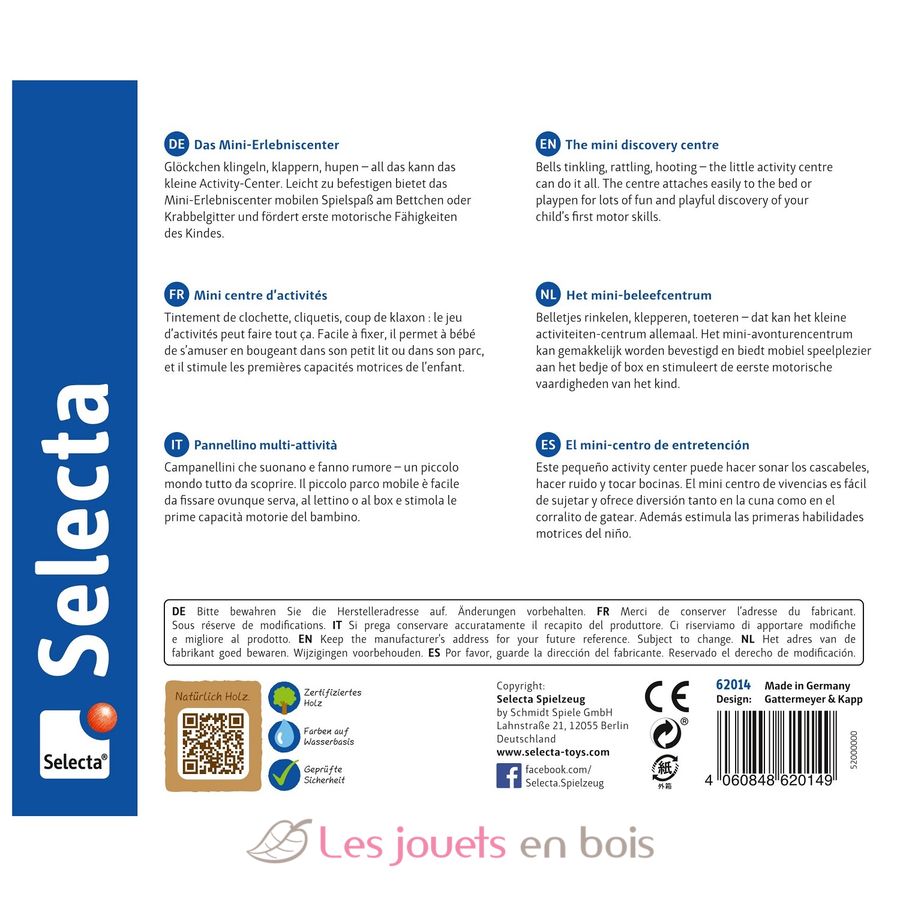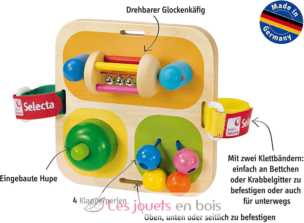 Tintement de clochette, cliquetis, coup de klaxon : le jeu d’activités peut faire tout ça. Facile à fixer, il permet à bébé de s’amuser en bougeant dans son petit lit ou dans son parc, et il stimule les premières capacités motrices de l’enfant. Grandeur : 14 x 14 cm