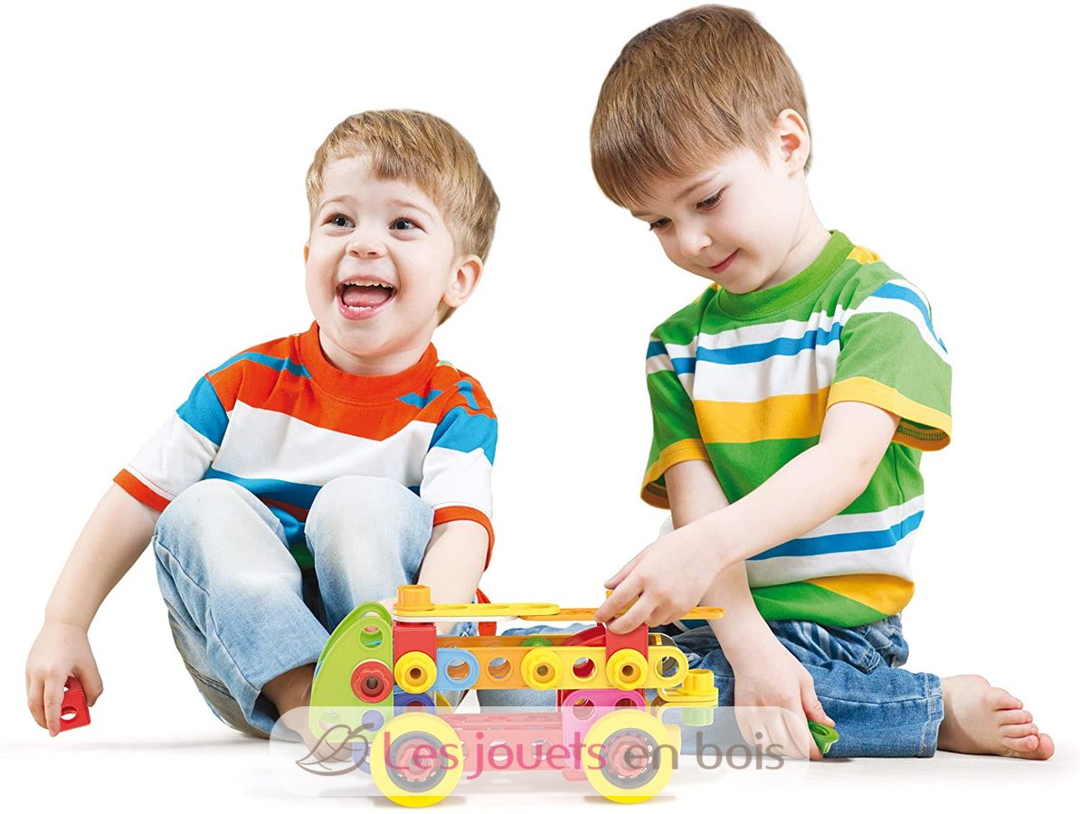 Les vis, les écrous, les plaquettes perforées en plastique sont à assembler sans outils. Tout ce dont l'enfant aura besoin sont ses mains et toute la fantaisie et l'imagination dont il dispose pour créer des hélicoptères, bulldozers, grues, voitures ou toute autre construction...
