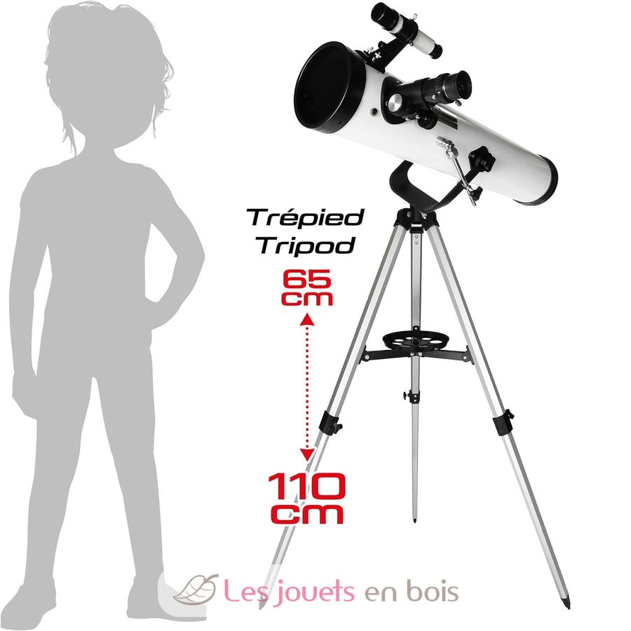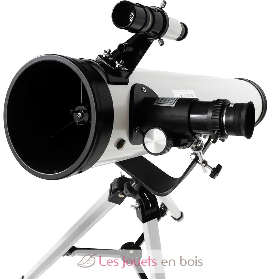 Tube entièrement en métal. Ouverture de 76 mm de diamètre et longueur focale de 700 mm. 3 oculaires fournis : 20 mm, 6 mm et un oculaire de Kellner 10 mm interchangeables. Trépied en aluminium avec deux positions : 65 et 110 cm.
