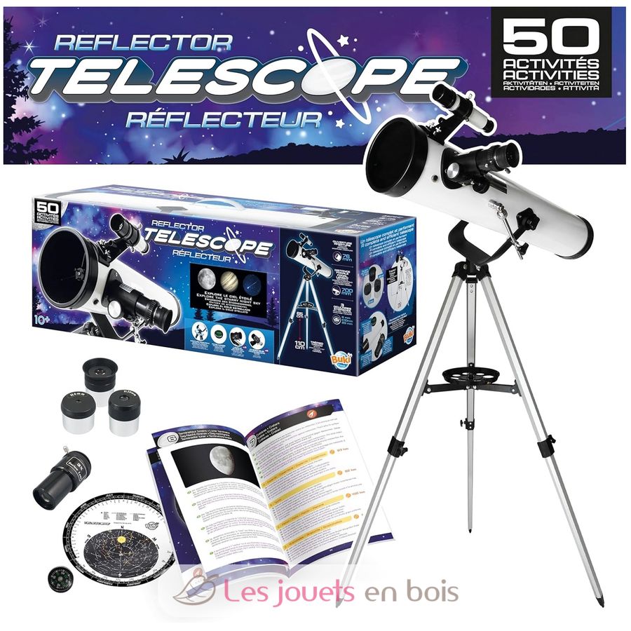 Un télescope réflecteur avec une notice de 50 activités pour découvrir le ciel étoilé, les planètes et le paysage lunaire.