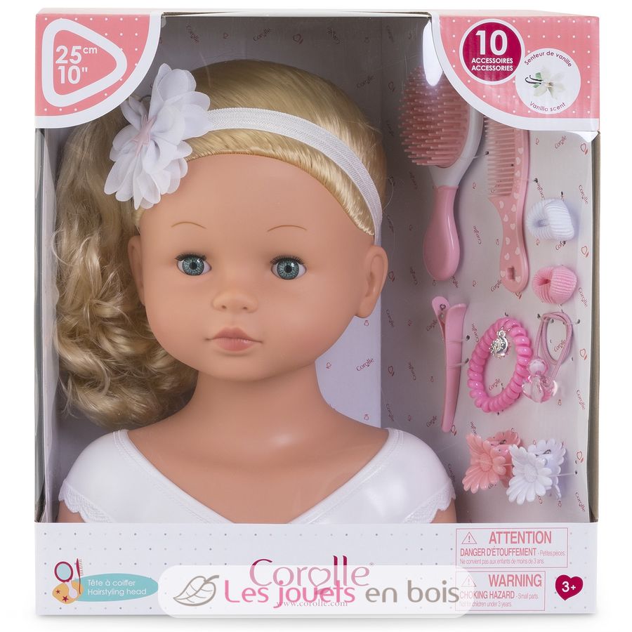 Cette tête à coiffer est conçue en vinyle doux au toucher, à la délicate senteur de vanille, signature des poupées Corolle. Les yeux sont fixes avec des cils.