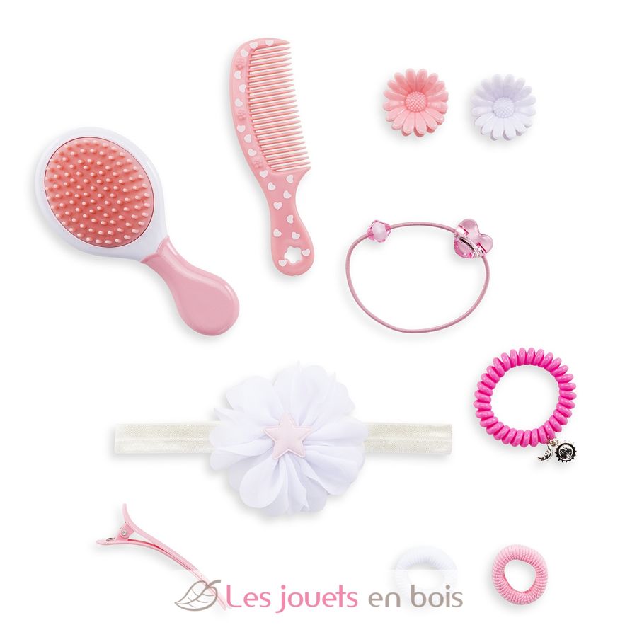Cette tête à coiffer possède 10 accessoires réalistes pour créer de nombreuses coiffures : 1 bandeau élastique blanc avec 1 fleur, 1 brosse à cheveux, 1 peigne, 2 petites pinces à griffes, 2 grandes pinces à griffes, 1 pince à cheveux plate, 1 élastique avec un cœur transparent et 1 élastique à spirale.