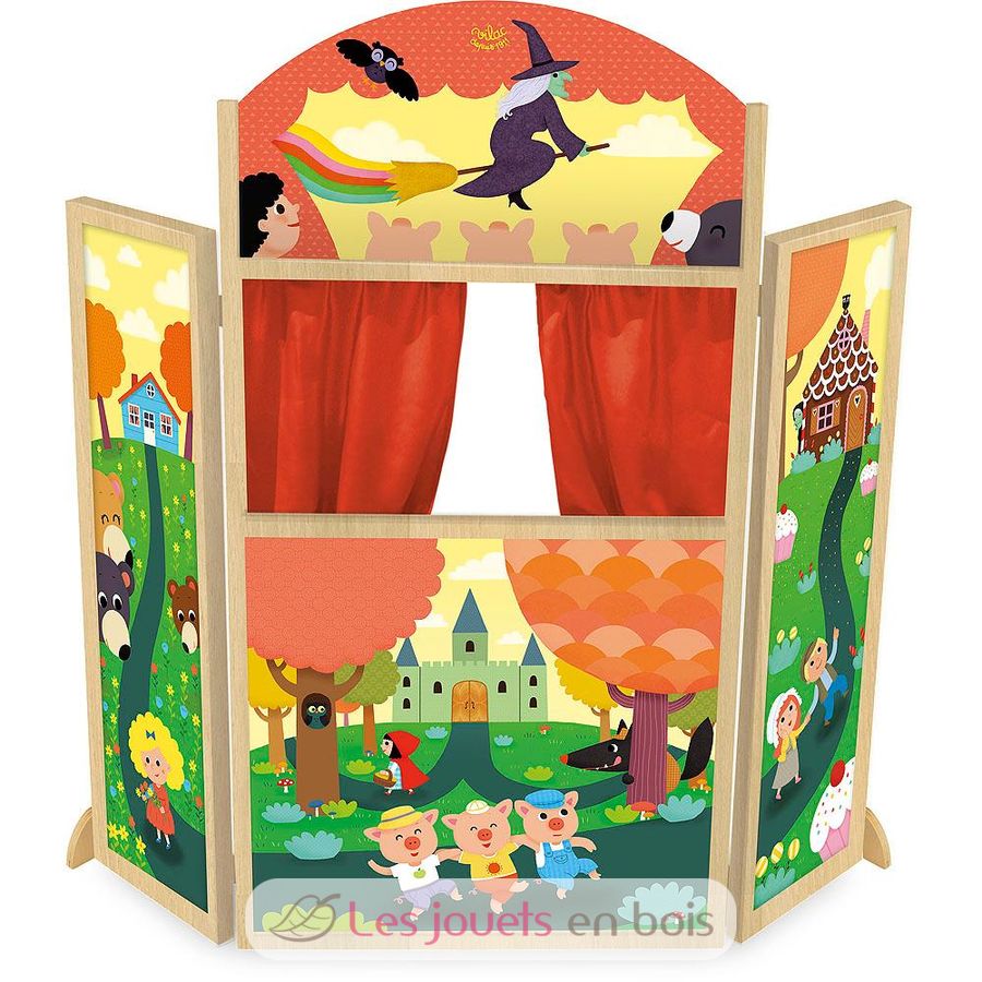 Joli théâtre de marionnettes pliable en bois de 122cm de hauteur par 117cm. Un théâtre décoré sur l'univers des contes par Mélusine, le petit chaperon rouge, les trois petits cochons, boucle d'or... Un magnifique théâtre en triptyque dont les héros de contes constituent le décor. Un théâtre de la marque Vilac. Référence 4624.