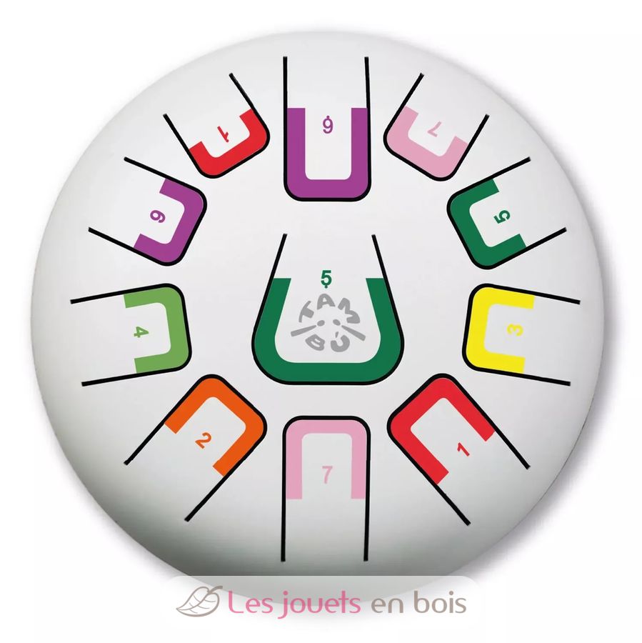 Ce tambour comporte 11 notes différenciées par des chiffres et des couleurs qui émettent des sons harmoniques relaxants. Il peut être joué de différentes manières, produisant chacune une intensité sonore différente : avec des baguettes, du bout des doigts ou avec les mains.