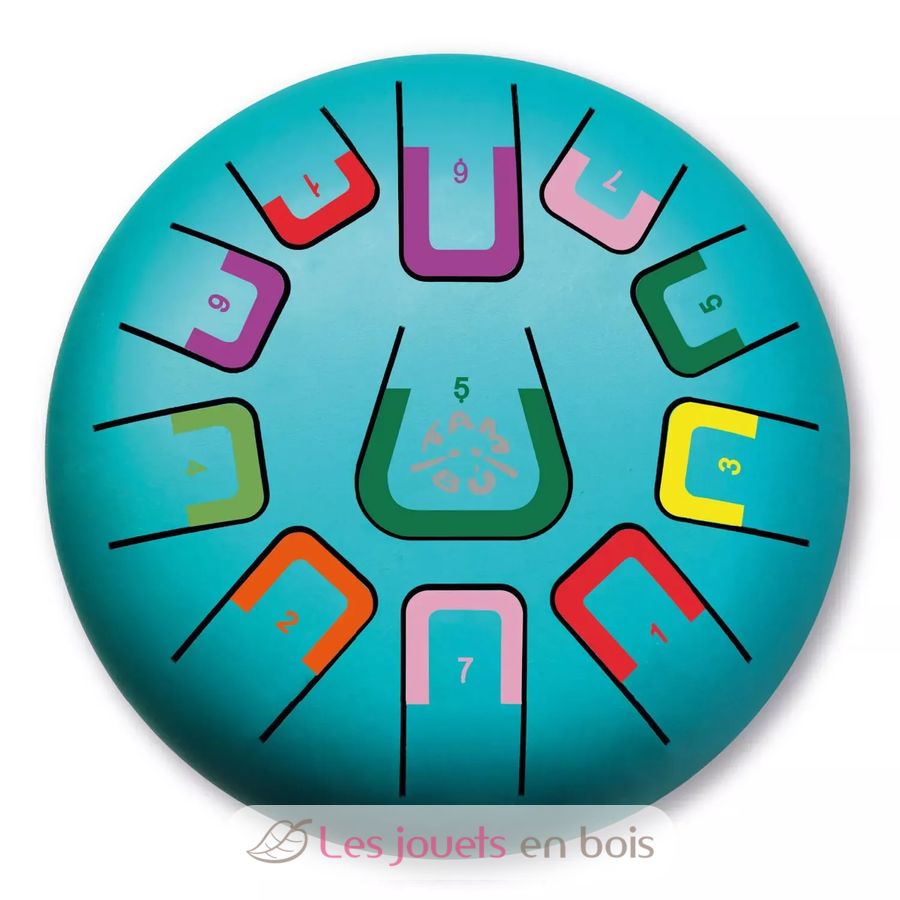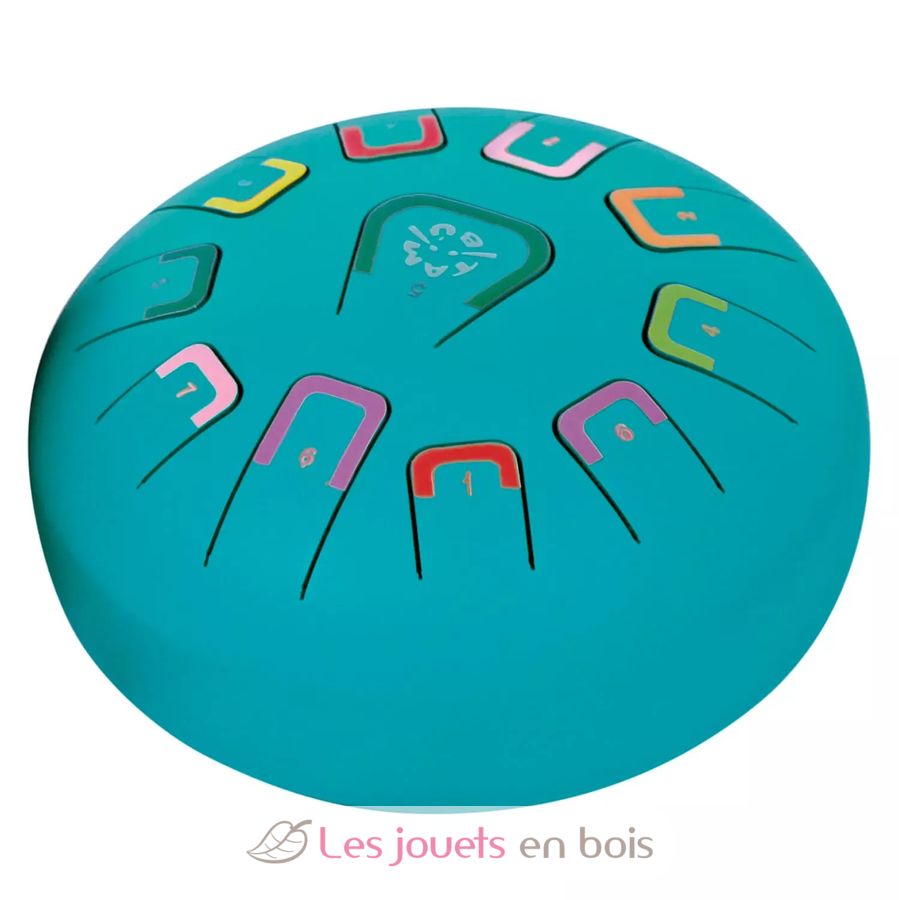 Ce tambour comporte 11 notes différenciées par des chiffres et des couleurs qui émettent des sons harmoniques relaxants. Il peut être joué de différentes manières, produisant chacune une intensité sonore différente : avec des baguettes, du bout des doigts ou avec les mains.
