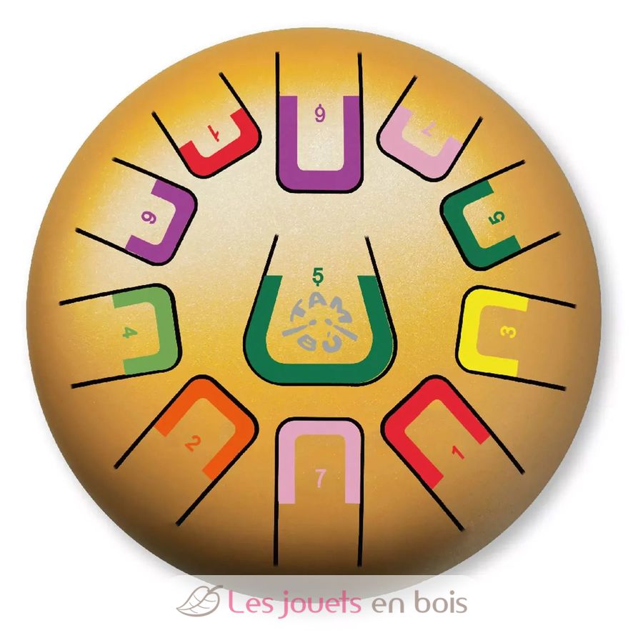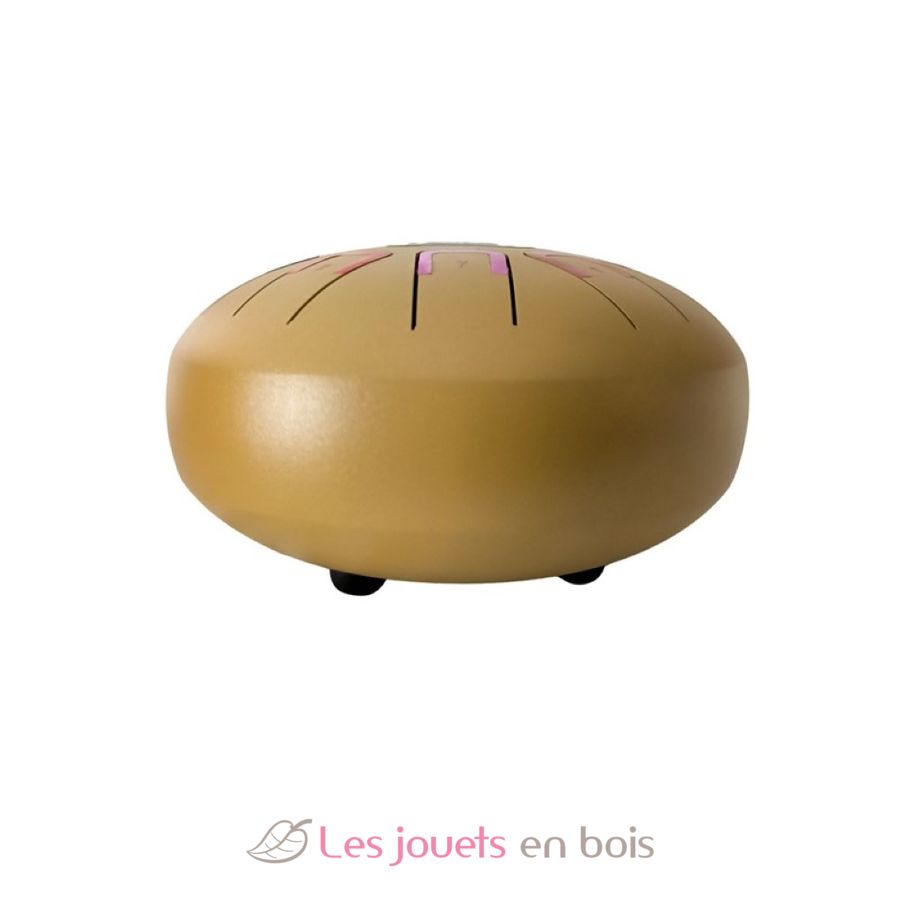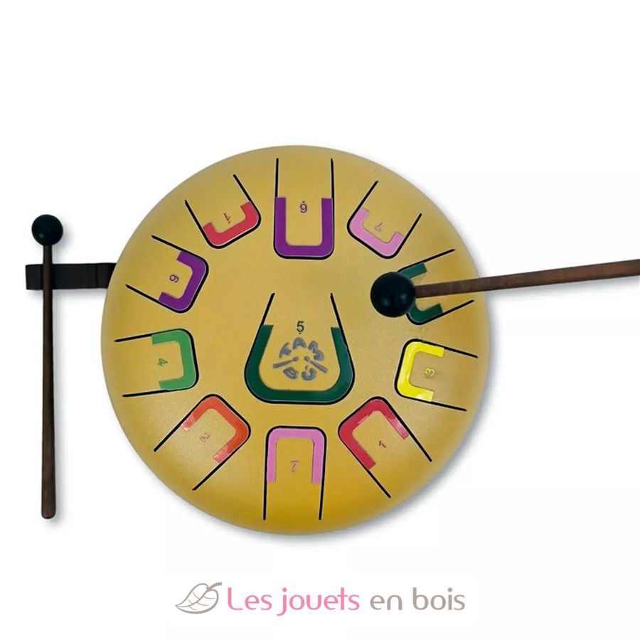 Ce tambour comporte 11 notes différenciées par des chiffres et des couleurs qui émettent des sons harmoniques relaxants. Il peut être joué de différentes manières, produisant chacune une intensité sonore différente : avec des baguettes, du bout des doigts ou avec les mains.
