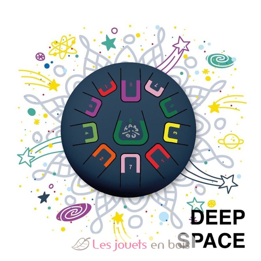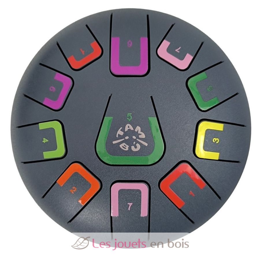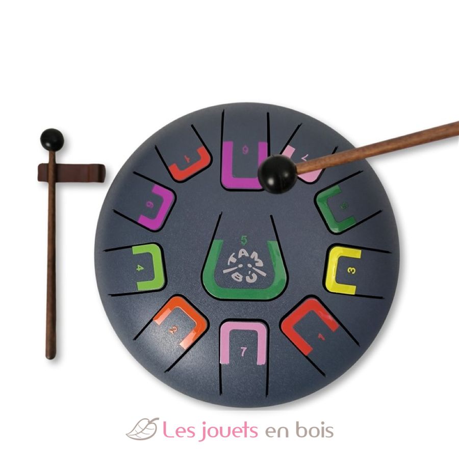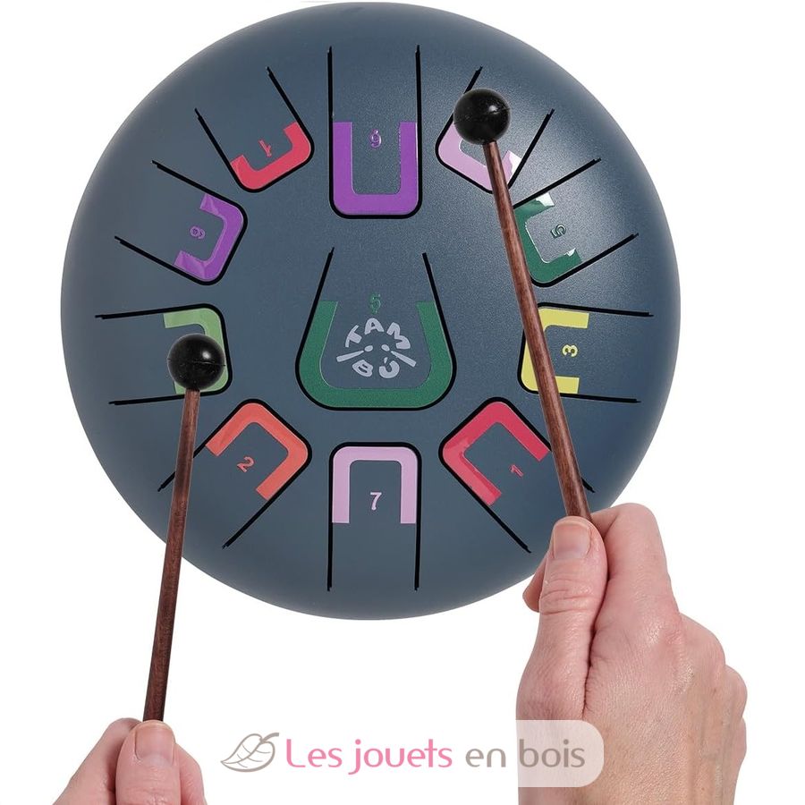 Ce tambour comporte 11 notes différenciées par des chiffres et des couleurs qui émettent des sons harmoniques relaxants. Il peut être joué de différentes manières, produisant chacune une intensité sonore différente : avec des baguettes, du bout des doigts ou avec les mains.