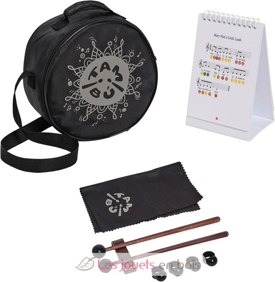 Contenu : 1 livre de partitions, 2 baguettes, 1 porte-baguettes, 4 médiators de doigts, 1 sac avec sangle pour le transporter et 1 chiffon de nettoyage.