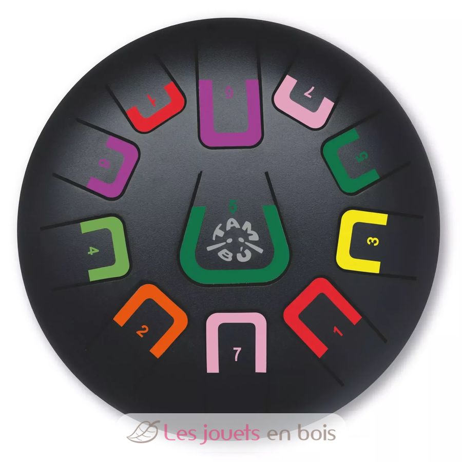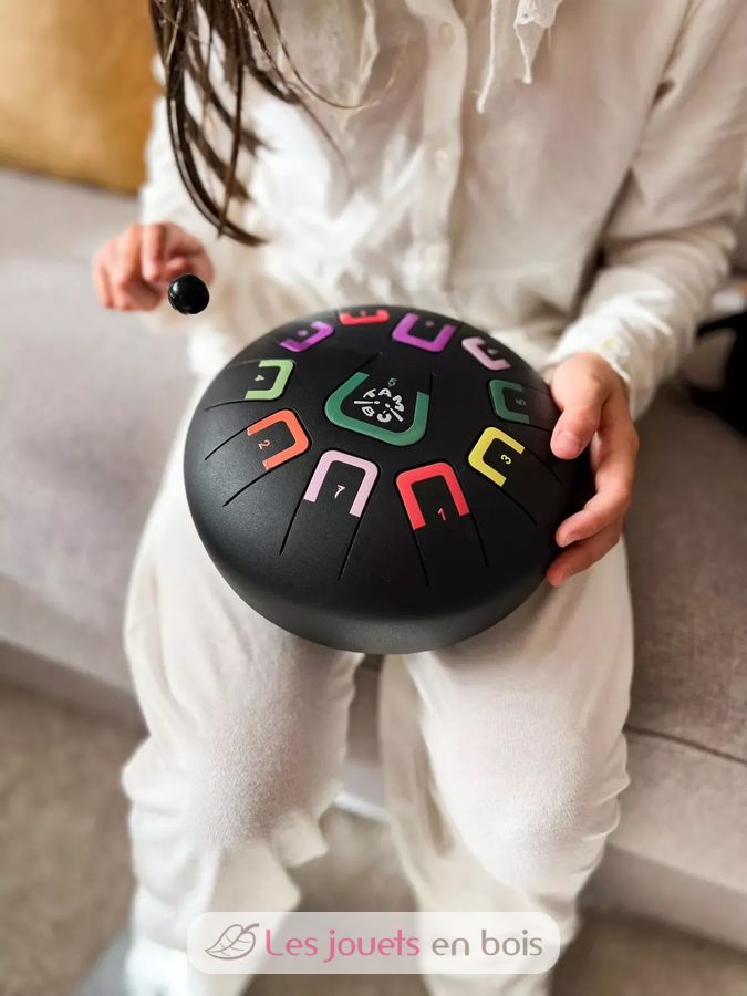 Ce tambour comporte 11 notes différenciées par des chiffres et des couleurs qui émettent des sons harmoniques relaxants. Il peut être joué de différentes manières, produisant chacune une intensité sonore différente : avec des baguettes, du bout des doigts ou avec les mains.