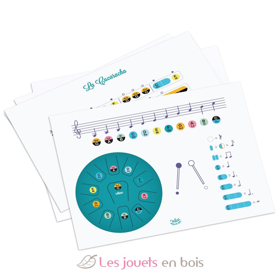 Une fiche explicative permettra également de comprendre la relation entre les sons produits par le tongue drum et la notation classique (gamme de Do écrite également avec les lettres anglo-saxonnes), ainsi que la correspondance avec la durée des notes, le rythme (croches, noires, blanches, etc...).