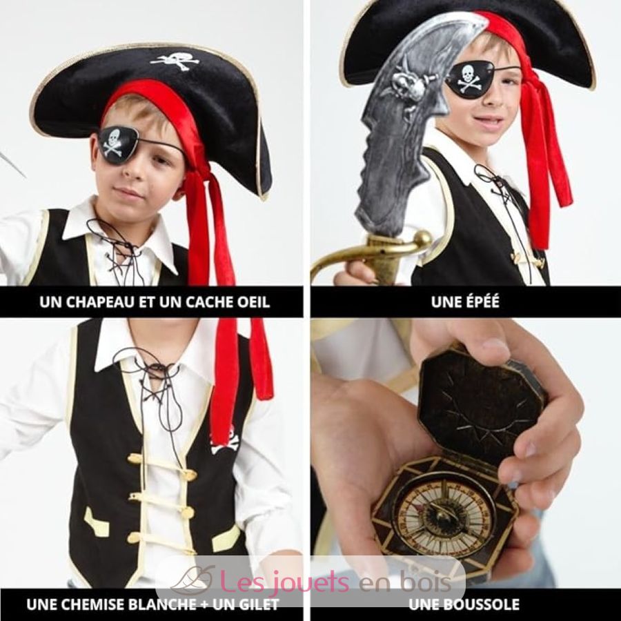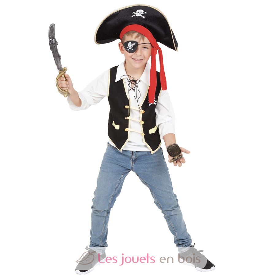 Ce déguisement pour enfant comprend une chemise blanche avec col, un gilet noir avec boutons dorés, un chapeau de pirate en velour noir et rouge, un sabre de pirate, un cache œil et une boussole.