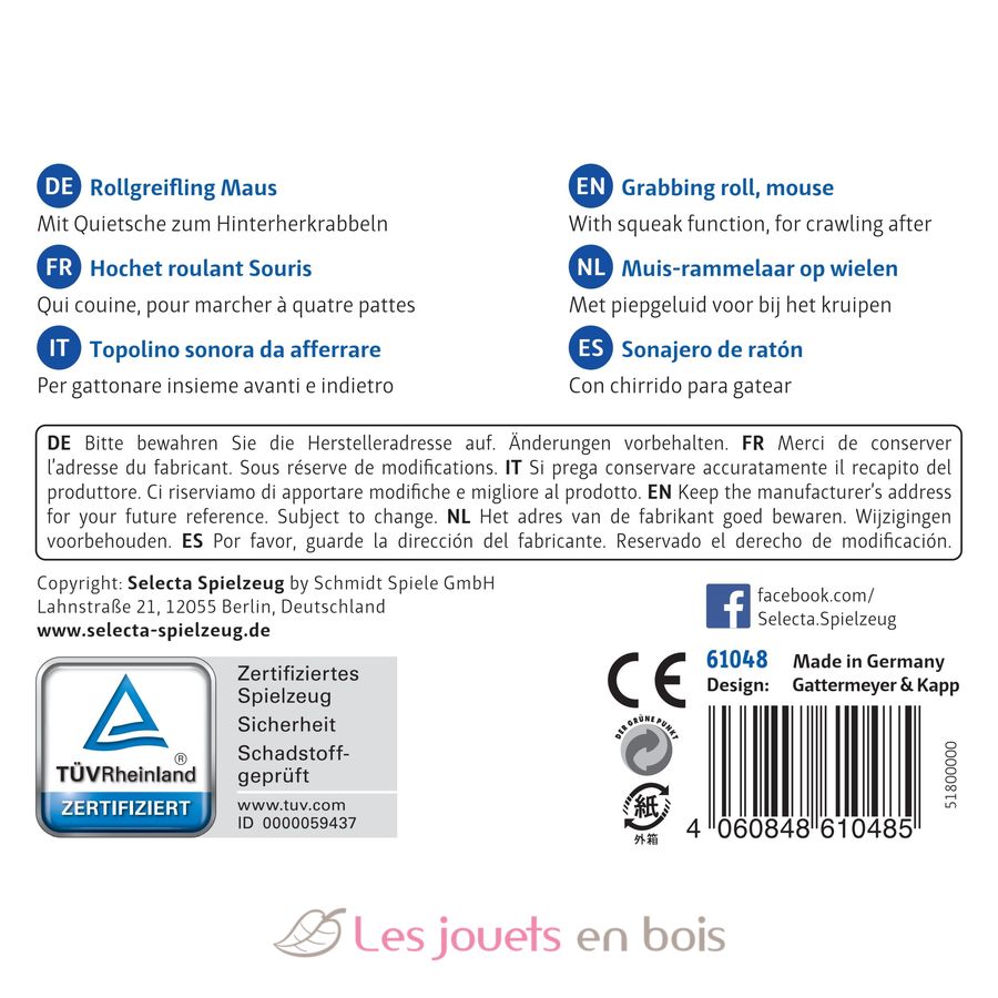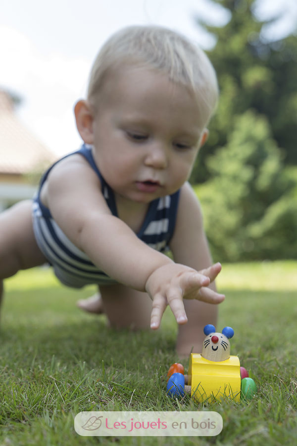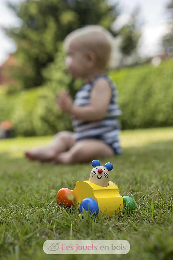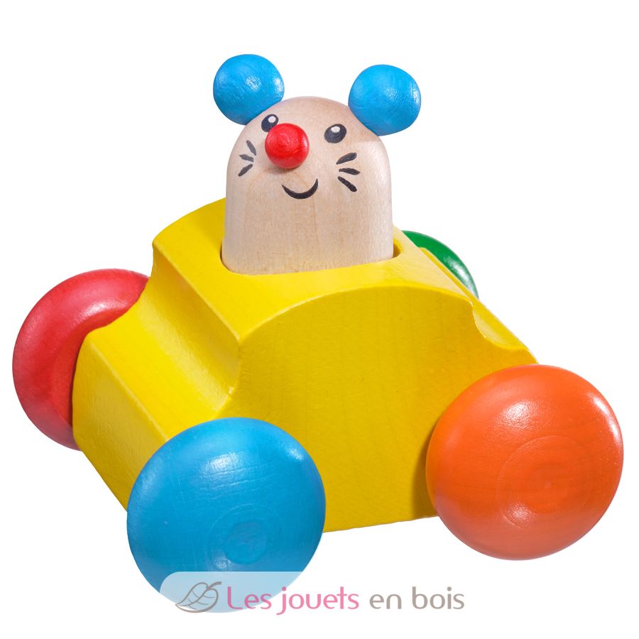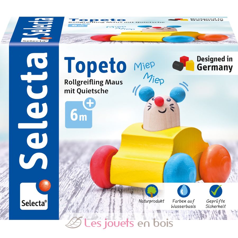 Topeto « Pouet--pouet » !! retentit gaiement le klaxon fromage lorsqu´on appuie sur la souris. On la pousse et vite vite, on court après à quatre pattes. grandeur 7 cm Un jouet en bois fabriqué en Allemagne par la société Selecta.