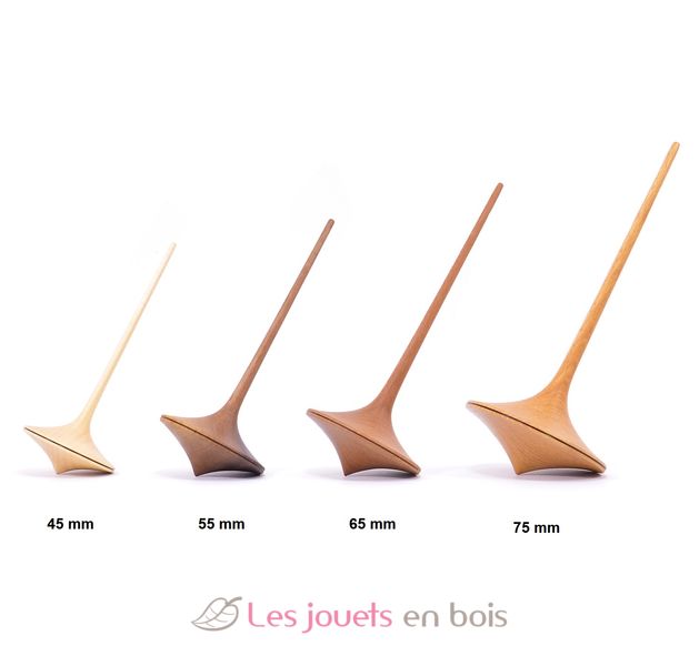 Toupie en bois Trumpo 65 mm (vendue à l'unité). Une toupie de niveau 3 (intermédiaire), un joli défi à maîtriser pour ceux qui ont compris les bases. Le modèle Trumpo est une toupie élégante avec un long manche qui peut être tourné avec le bout des doigts ou entre les paumes.
