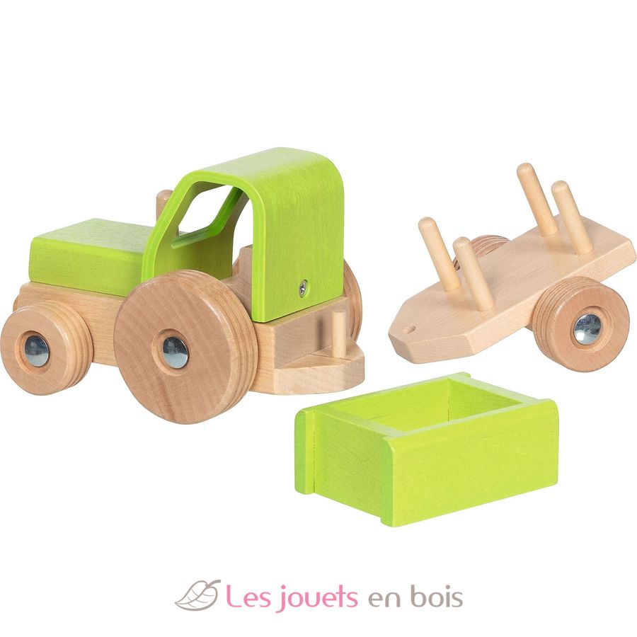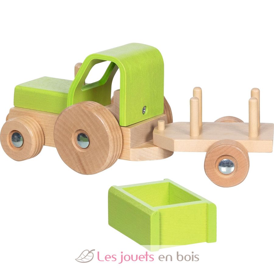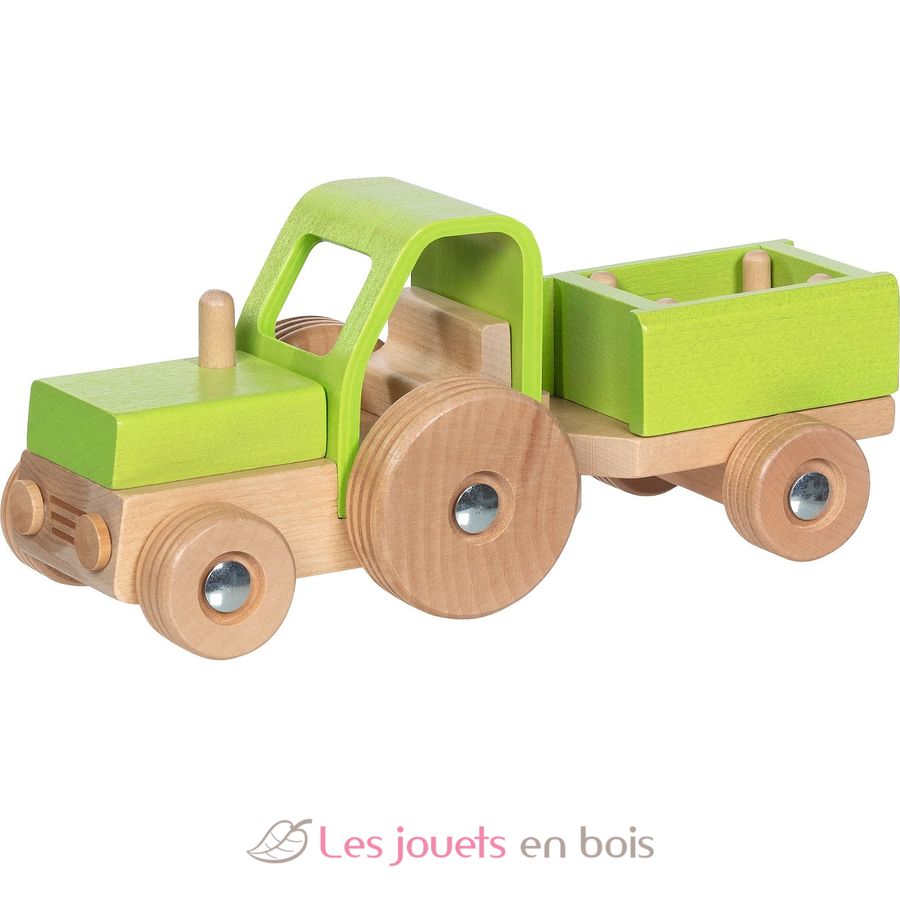 Tracteur avec remorque vert, un véhicule en bois miniature de la marque Goki.