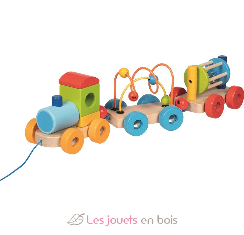 Ce jouet d'éveil réuni 4 jouets en un : la locomotive propose des blocs de construction à empiler, le premier wagon est doté d'un circuit de perles, le second wagon remorque un rouleau qui tourne avec grelot, le tout sur un superbe train en bois à tirer.