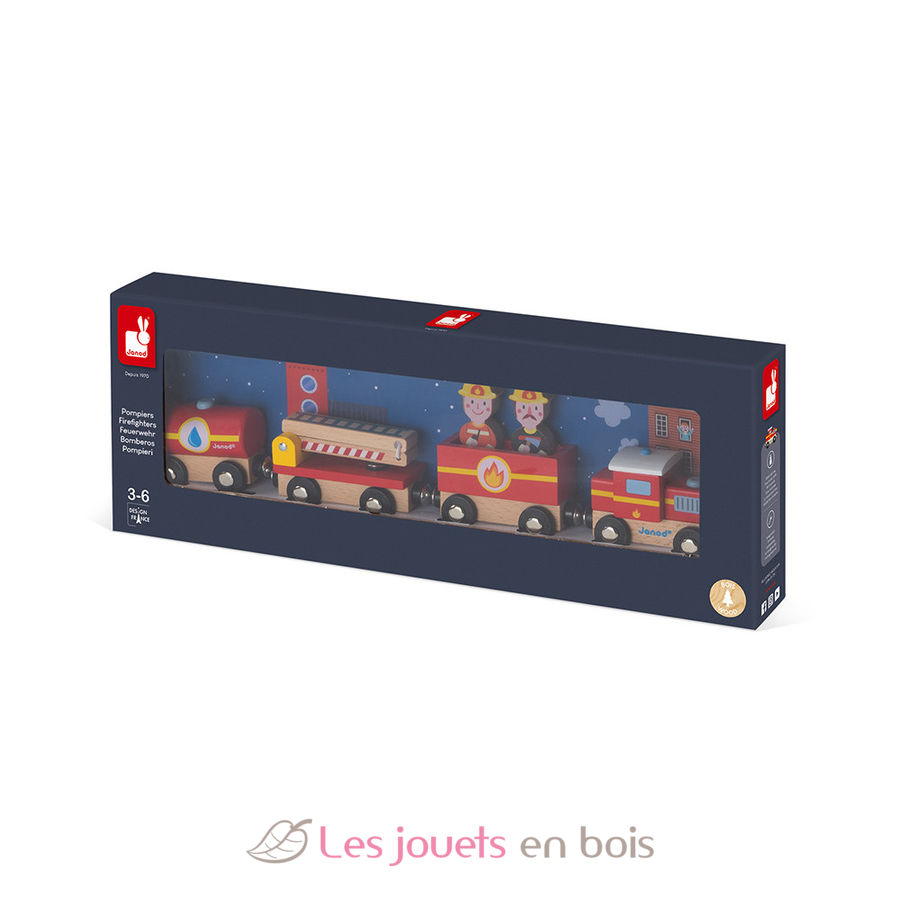 Train Pompiers Story, un train en bois de la marque Janod. Référence J08590.