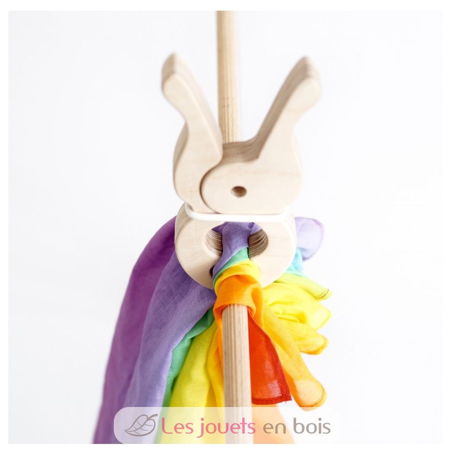 Le set comprend un magnifique tissu en coton biologique avec un motif arc-en-ciel, ainsi que quatre pinces géantes spécialement conçues pour s'adapter aux baguettes Trigonos.