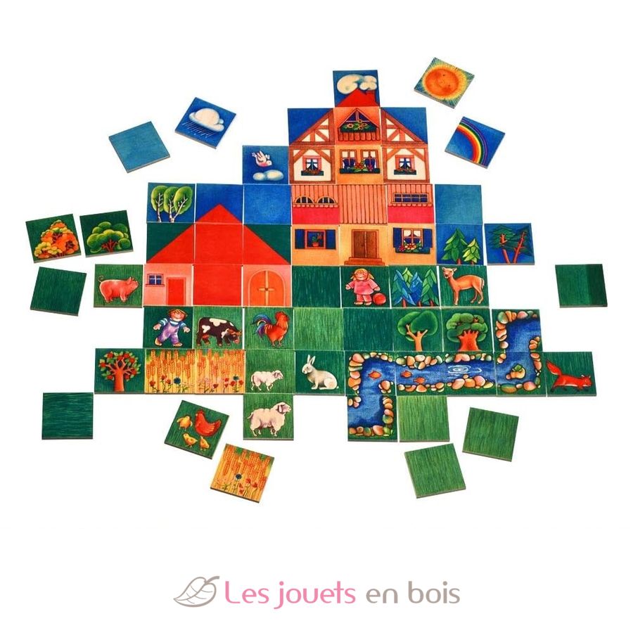 Ce puzzle se compose de 80 plaquettes en bois sérigraphiées (4,5 x 4,5 cm) qui peuvent être combinées de multiples façons. A chaque partie, l’enfant crée un nouveau monde.