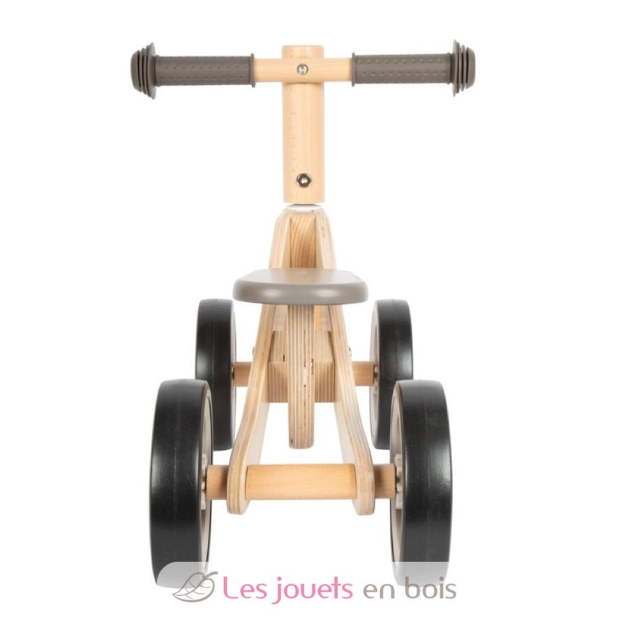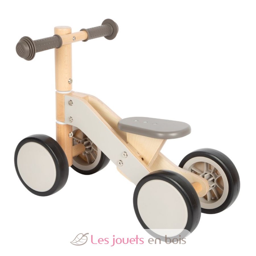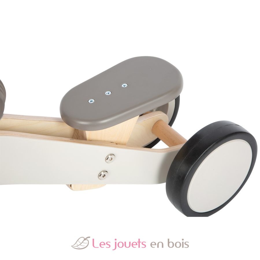 Les roues arrière de ce porteur en bois sont très proches l'une de l'autre et offrent ainsi un grand espace pour les jambes lors de la poussée. La sécurité nécessaire est assurée par la stabilité, la limitation du braquage sur le guidon et les poignées en plastique qui empêchent les mains de glisser. Le siège peut être réglé en hauteur et à distance du guidon, ce qui permet d'adapter le véhicule à la taille de l'enfant. Hauteur du siège : env. 22 - 25 cm.