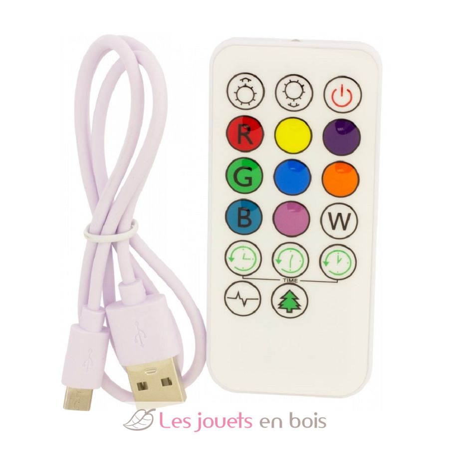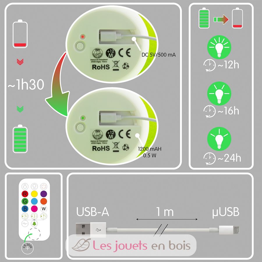 La veilleuse fonctionne sur batterie. Celle-ci se recharge grâce au câble USB (fourni) en se connectant sur un appareil USB ou sur un chargeur d'alimentation universelle (type chargeur de téléphone mobile).La télécommande (pile incluse) permet d'accéder à des fonctions supplémentaires, par exemple la fonction timer (15, 30 ou 60 min).