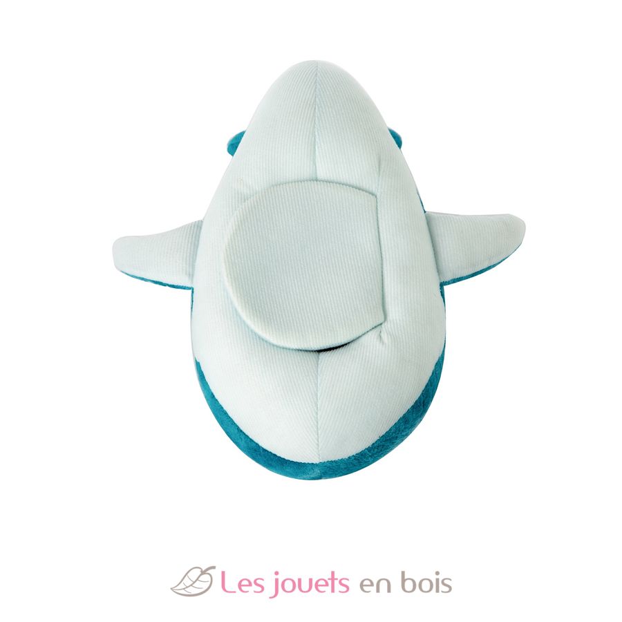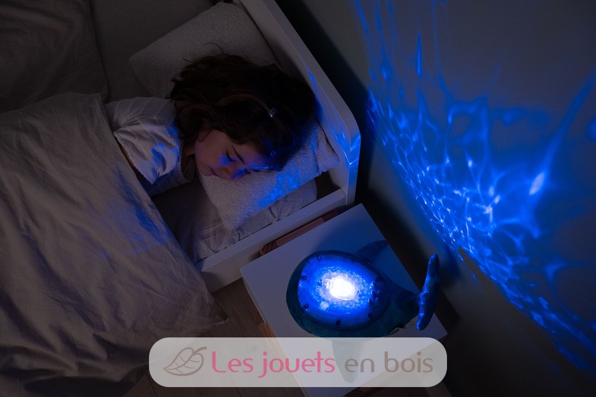 Douce peluche la journée, elle se transforme en veilleuse rassurante la nuit venue. Cette veilleuse projette des images de fonds sous-marins et l'intensité lumineuse peut être ajustée. Quatre types de sons apaisants sont disponibles : 2 bruits blancs (océan) et 2 mélodies avec 6 niveaux sonores différents. Une minuterie de 23 minutes avec arrêt automatique est intégrée. Grâce à sa technologie LED, le projecteur reste froid au toucher et parfaitement sûr, même sous les draps. La veilleuse se recharge grâce à un câble USB-C (non fourni).